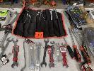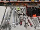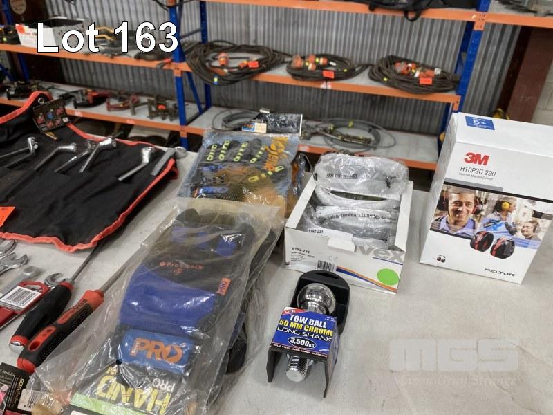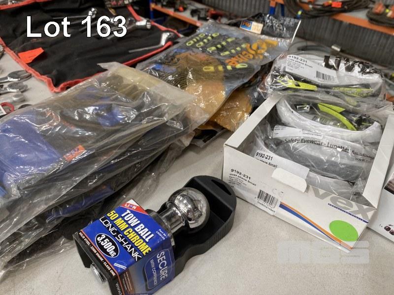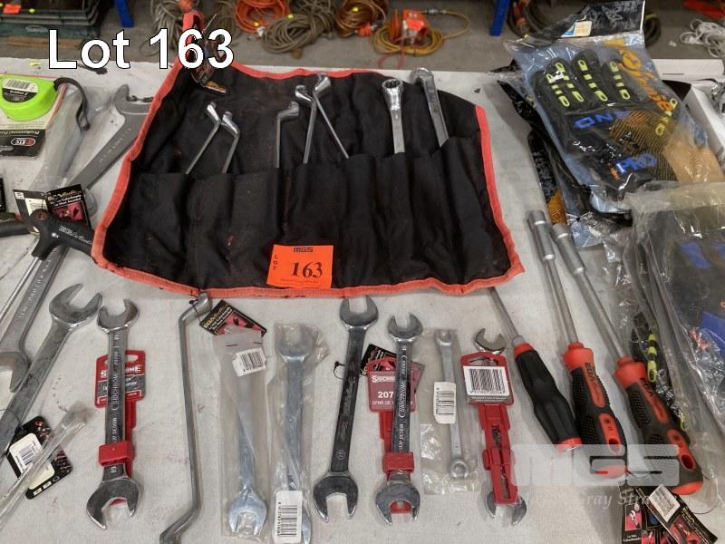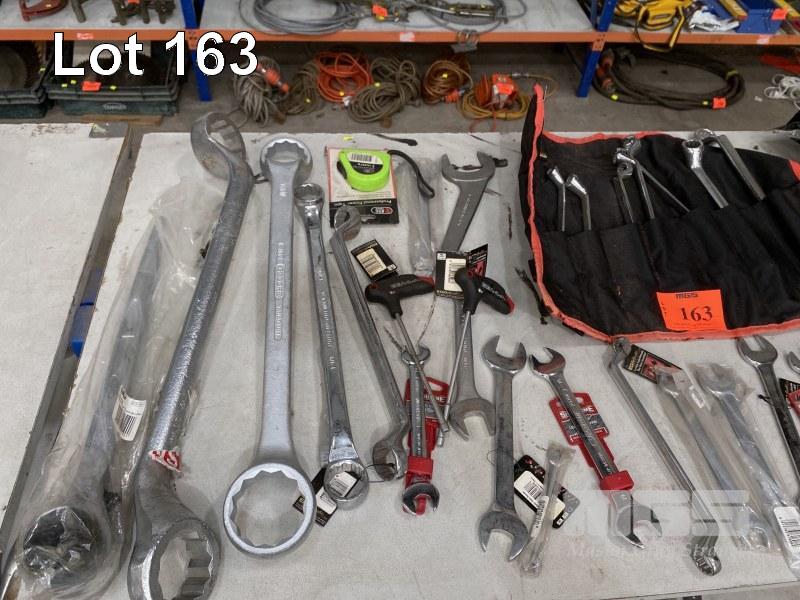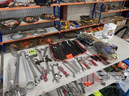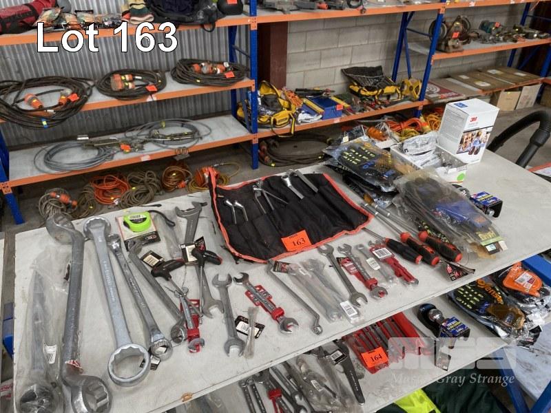 ASSORTED NEW HAND TOOLS, SIDCHROME, RING & OPEN SPANNERS, UP TO 1 1/4", DRIVES, GLOVES, GOGGLE, ETC, 1 x SHELF