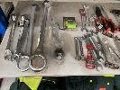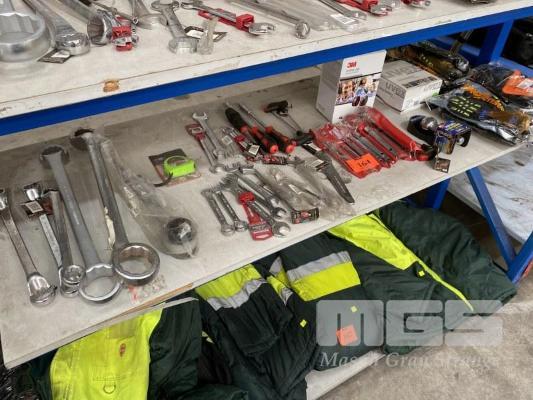 ASSORTED NEW HAND TOOLS, SIDCHROME, RING & OPEN SPANNERS, UP TO 1 1/4", DRIVES, GLOVES, GOGGLE, ETC, 1 x SHELF
