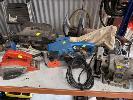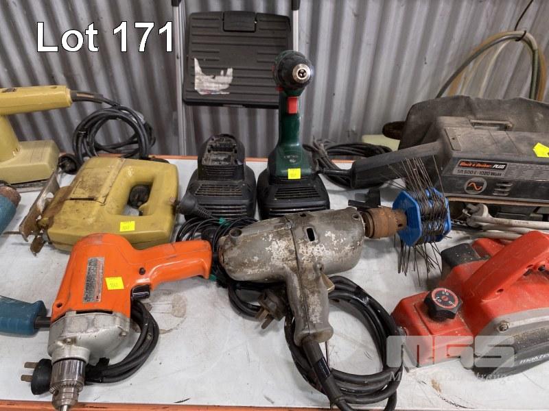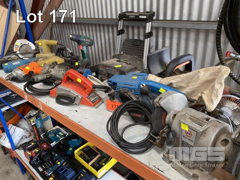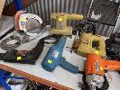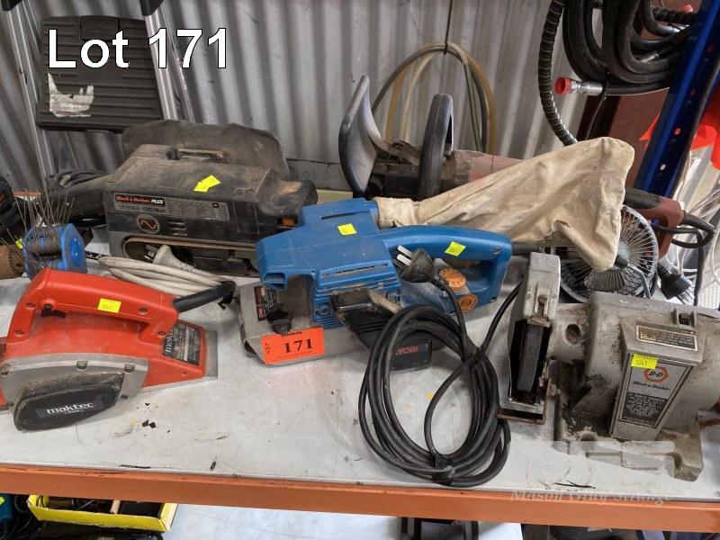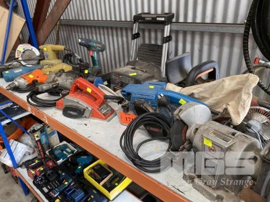 2 x BELT SANDERS, BENCH GRINDER, PLANER, SANDER, DRILLS, HEAT GUN, CIRCULAR SAW & CORDLESS DRILL, 1 x SHELF