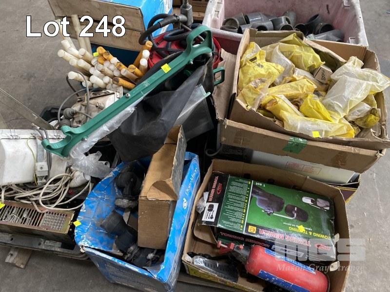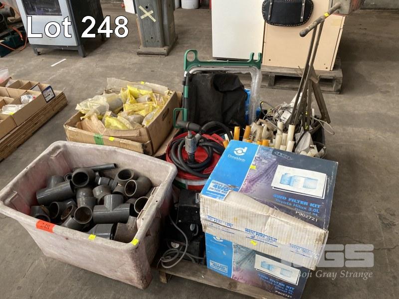 DRUM PUMP, 20 LITRE, COMPOSITE HANDLES, STRAPPING DISPENSER, LIGHTING, ASSORTED FILTERS, PVC PIPE JOINTS, ETC,