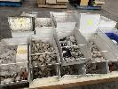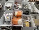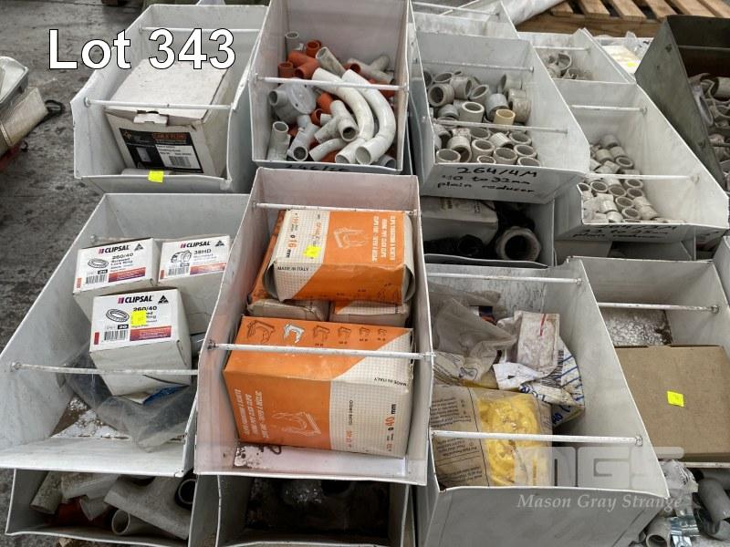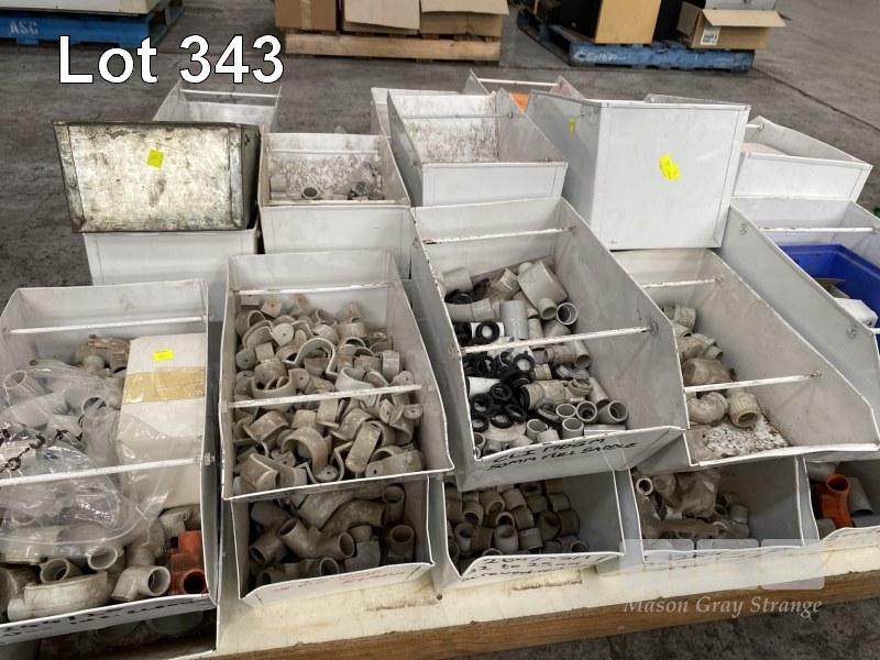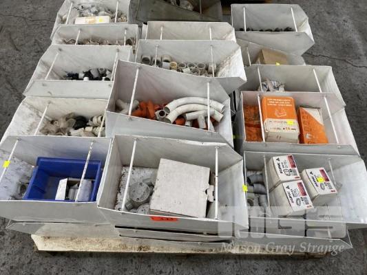 ASSORTED ELECTRICAL CONDUIT FITTINGS, CLIPS, LOCK RINGS, SADDLES, JUNCTION BOXES, ETC IN STACKABLE STEEL PARTS DRAWERS