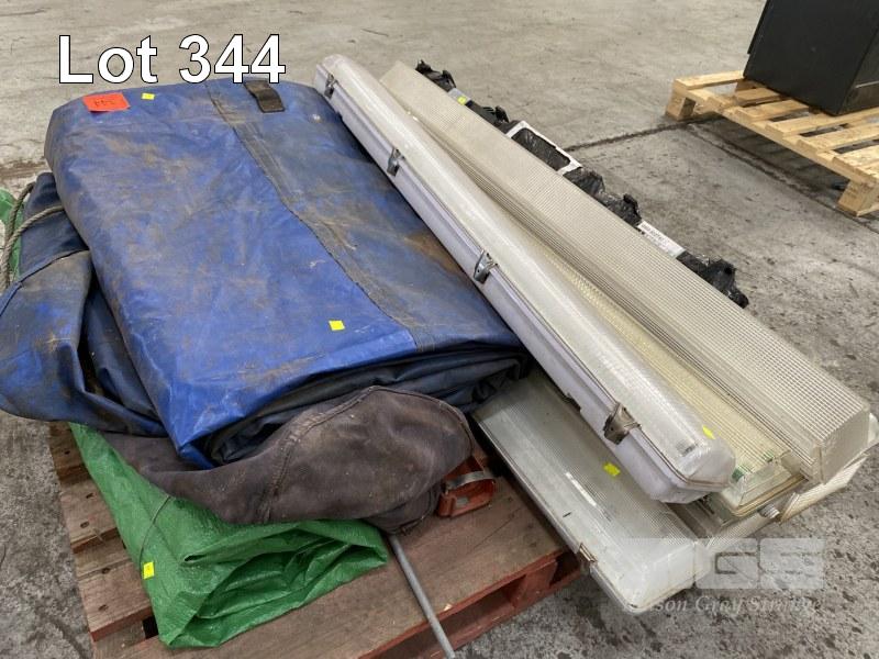 PAIR PLASTIC TARPS, BLUE & GREEN, ASSORTED FLURO LIGHT FIXTURES,