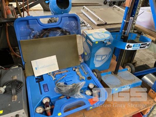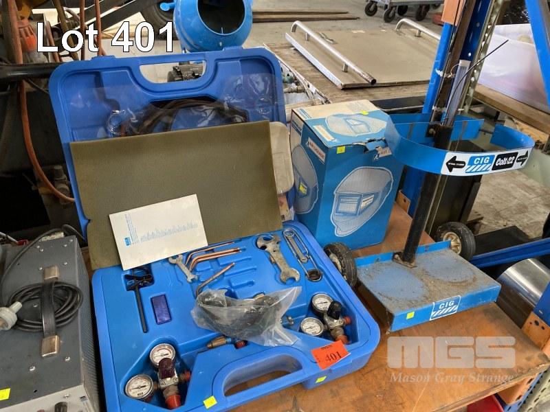 OXY ACETYLENE WELDING SET, CIG INC TORCHES, REGS, FACE SHIELD, BOTTLE TROLLEY & HOSES IN CARRY CASE