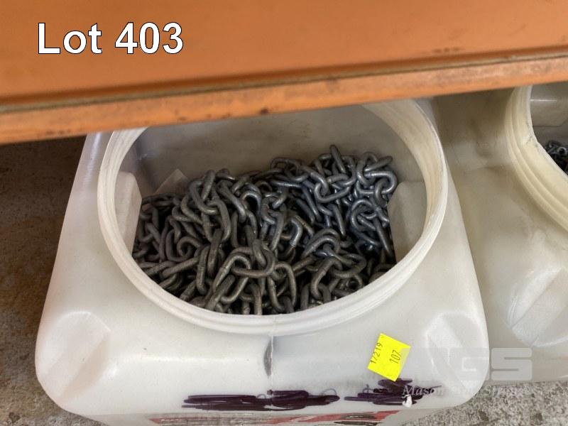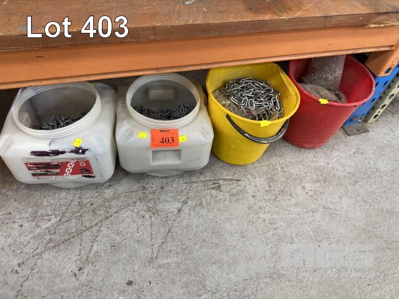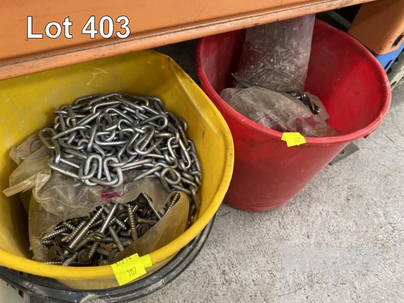 4 x BUCKETS ASSORTED GALV CHAIN, FITTINGS, SCREWS, ETC