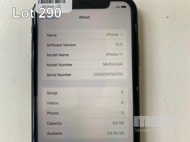 APPLE iPHONE 11, 64GB, BLACK, MODEL MHDA3X/A (NO CHARGER, NO CABLE) S/N:DX3DC0T5N735