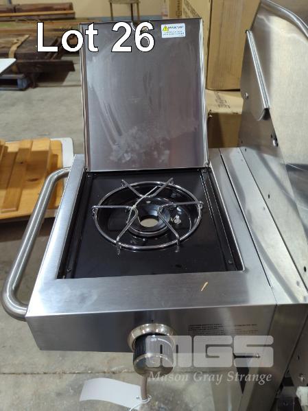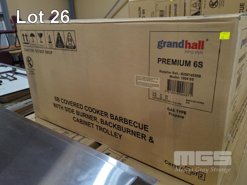 GRANDHALL PREMIUM 6S STAINLESS STEEL COVERED COOKER GAS BBQ 6-BURNER WITH SIDE BURNER, BACKBURNER & CABINET TROLLEY. NEW IN BOX (2 x BOXES). RRP $1,799