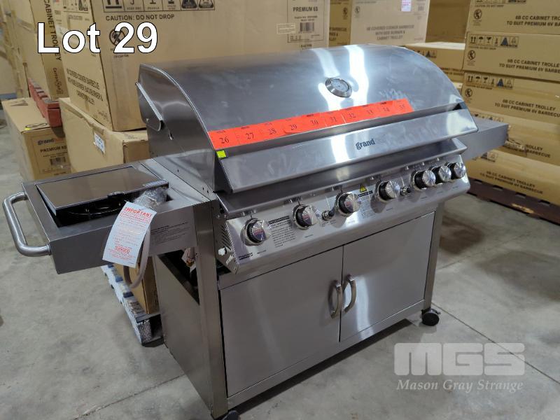 GRANDHALL PREMIUM 6S STAINLESS STEEL COVERED COOKER GAS BBQ 6-BURNER WITH SIDE BURNER, BACKBURNER & CABINET TROLLEY. NEW IN BOX (2 x BOXES). RRP $1,799