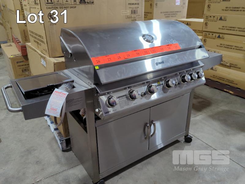 GRANDHALL PREMIUM 6S STAINLESS STEEL COVERED COOKER GAS BBQ 6-BURNER WITH SIDE BURNER, BACKBURNER & CABINET TROLLEY. NEW IN BOX (2 x BOXES). RRP $1,799