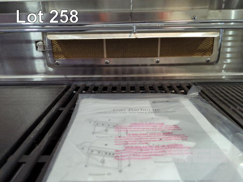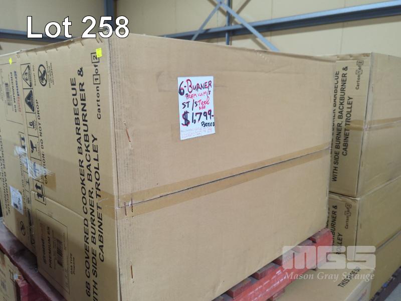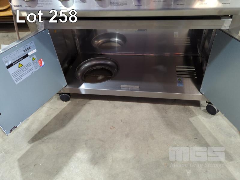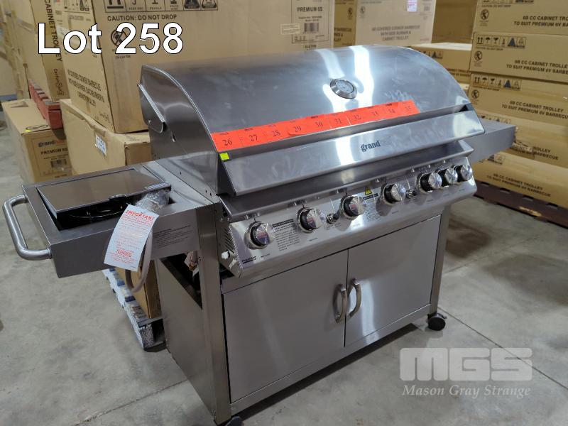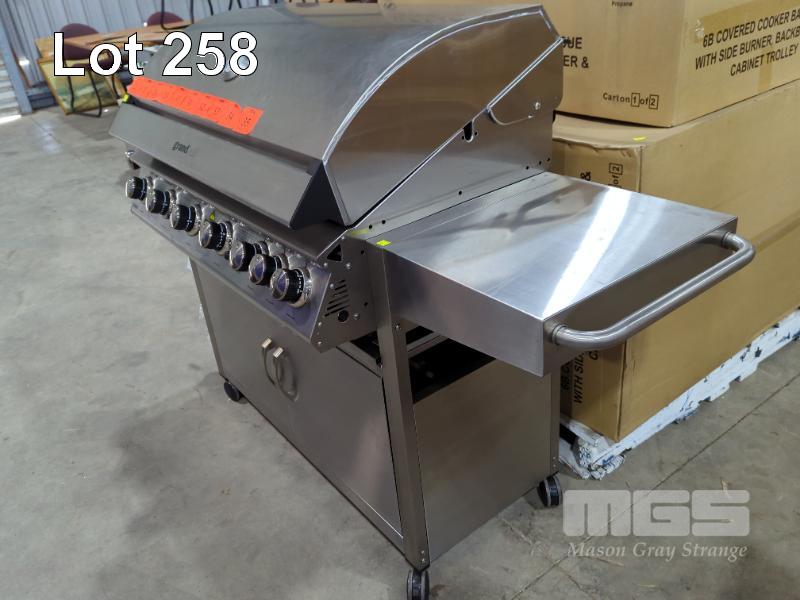 GRANDHALL PREMIUM 6S STAINLESS STEEL COVERED COOKER GAS BBQ 6-BURNER WITH SIDE BURNER, BACKBURNER & CABINET TROLLEY. NEW IN BOX (2 x BOXES). RRP $1,799