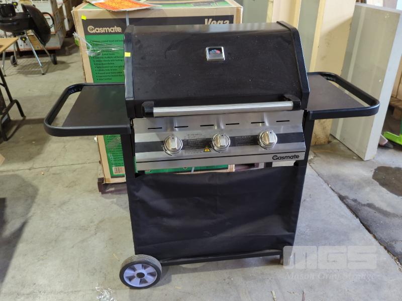 GASMATE VEGA MOBILE HOODED GAS BBQ. 3-BURNER IN VITREOUS ENAMEL WITH STAINLESS STEEL FASCIA. NEW IN BOX. RRP $399