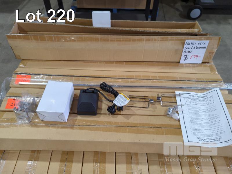 ELECTRIC STAINLESS STEEL ROTISSERIE KIT 240V A.C. MOTOR 1095 MM SPIT ROD, 2 X SKEWER FORKS, COLLAR, MOUNTING BRACKETS ETC. * SUIT 6-BURNER BBQ * RRP $199