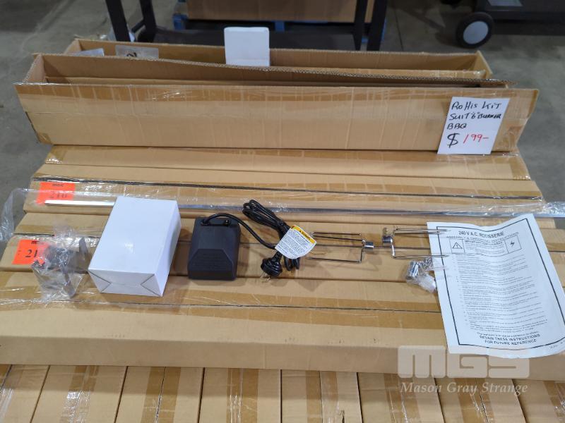 ELECTRIC STAINLESS STEEL ROTISSERIE KIT 240V A.C. MOTOR 1095 MM SPIT ROD, 2 X SKEWER FORKS, COLLAR, MOUNTING BRACKETS ETC. * SUIT 6-BURNER BBQ * RRP $199