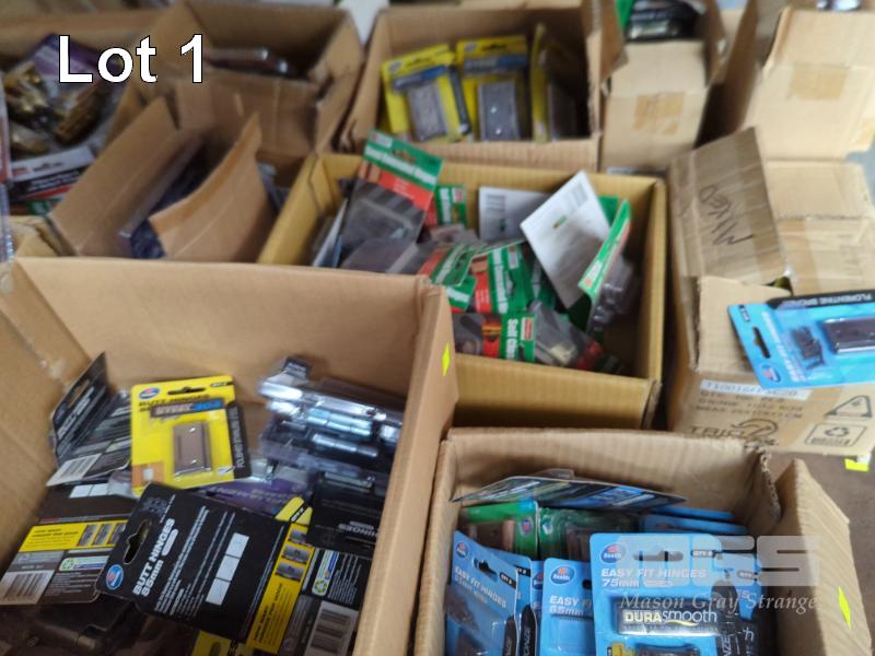 LARGE QUANTITY OF ASSORTED DOOR HINGE PACKS. ALL NEW. BLISTER PACK & CLAMSHELL PACK. BRANDS INCLUDE LANE SECURITY, ZENITH, TRIO, HOWARD SILVER'S, PRESTIGE ETC. MULTIPLE TYPES & SIZES. (2 X SHELVES)