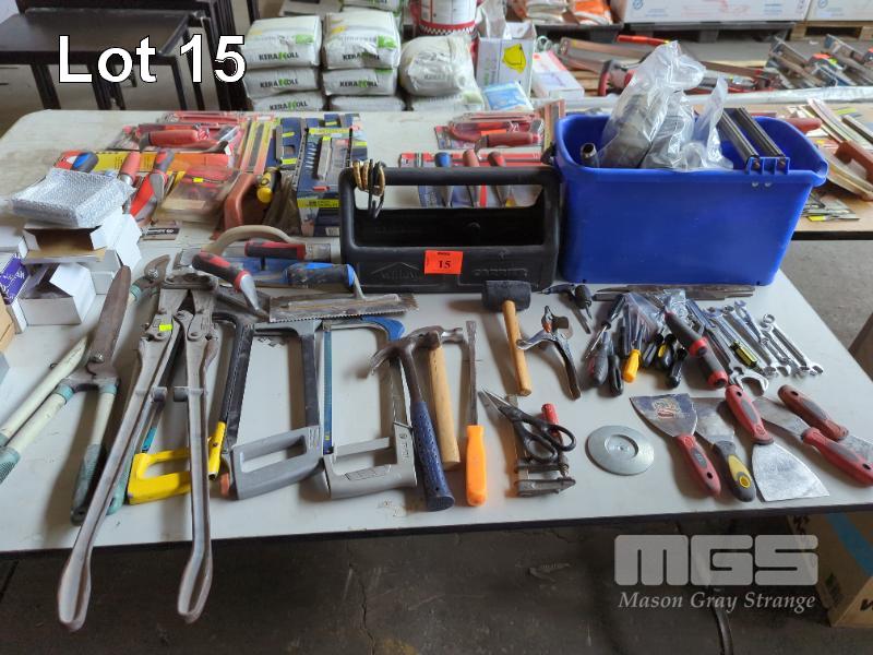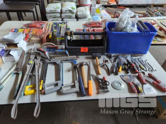 ASSORTED TOOLS INCLUDES WILLOW TOOL CARRY, RECORD 930 BOT CUTTERS, TROWELS, HACKSAWS, HAMMERS, SCREWDRIVERS, RING SPANNERS, STRAPS ETC.