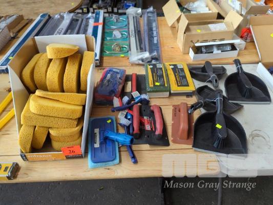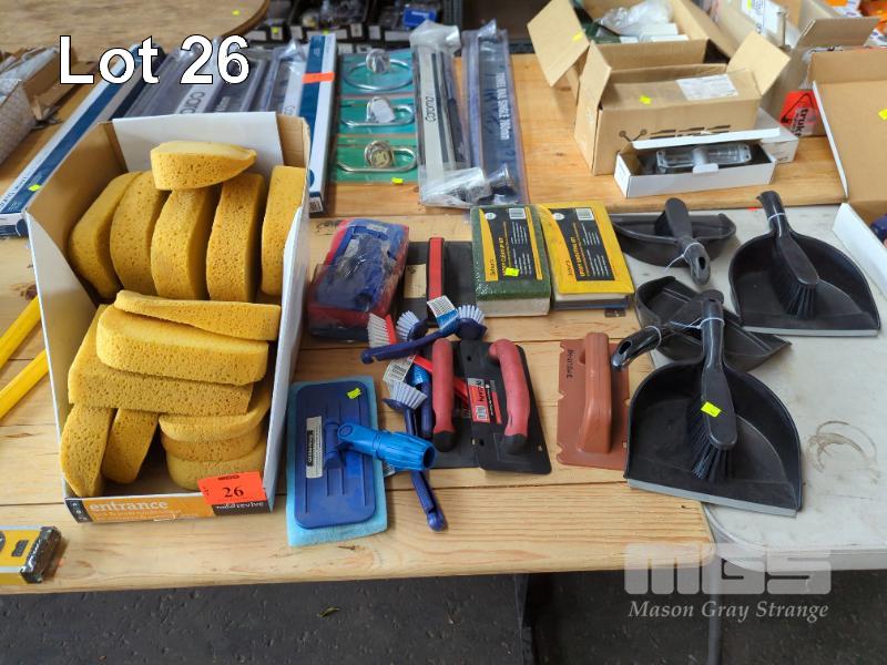 TILE PREP AND CLEANING ITEMS. INCLUDES SPONGES, CLIP ON SPONGE HANDLES, 2 X GLITTERBUG SCOURER PAD HOLDERS AND PADS, 4 X PLASTIC DUSTPANS & BRUSHES ETC.