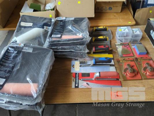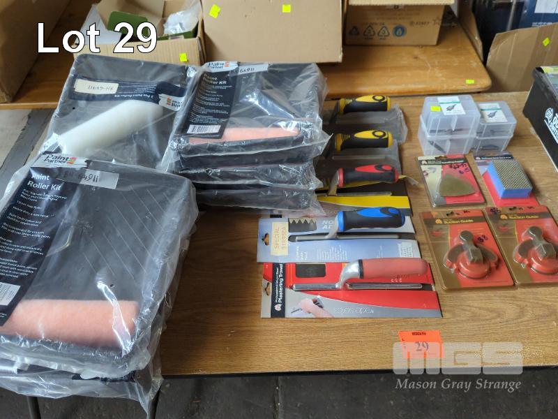 ASSORTED TILING TOOLS AND AIDS INCLUDING 2 X LAUXES TCT HOLE SAWS. 80 MM & 72 MM. VERSA TOOL.DIAMOND SANDING PAPER, 60 GRIT DIAMOND HAND SANDING PAD AND 2 X DRILL BIT SUCTION GUIDES. 5 X ASSORTED TROWELS, 9 X PAINT ROLLER KITS.