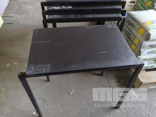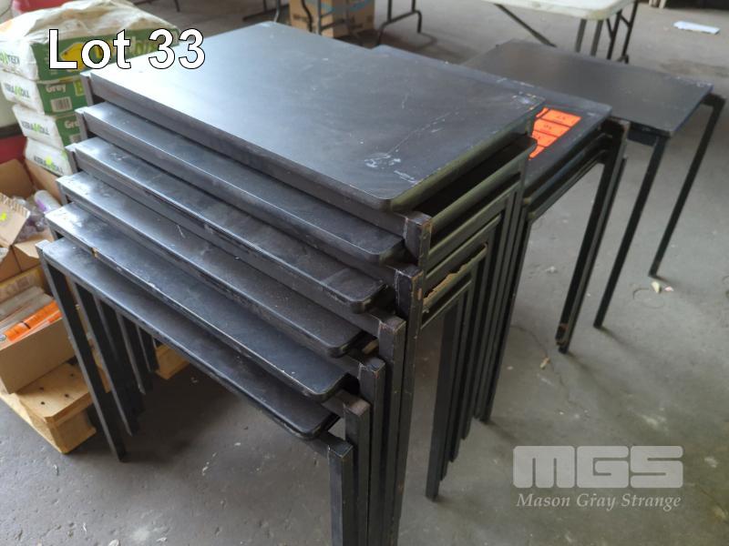 10 X STACKABLE EXAM DESKS - STEEL FRAME, LAMINATE TOPS ALL IN BLACK.