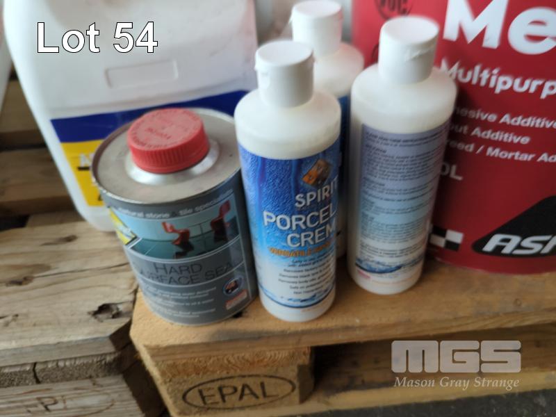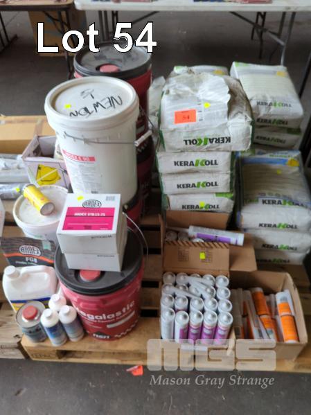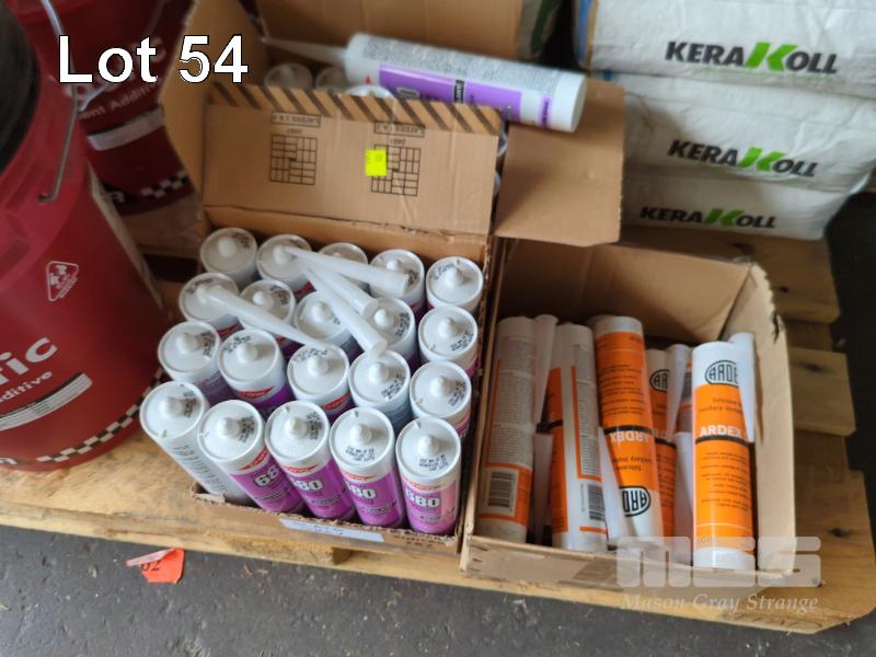 ASSORTED TILE ADHESIVES, PRIMERS, SEALANTS, GROUTS AND ASSOCIATED PRODUCTS. INCLUDES... 3 X 20 L MEGALASTIC MULTI-PURPOSE CEMENT ADDITIVE. 20 L ARDEX E 90 2 X ROLLS ARDEX STB 15-75 SELF ADHESIVE BUTYNOL TAPE. 50 X TUBES SILICONE SEALANT 7 X 20 KG BAGS KERAKOLL BIOFLEX S1 ZERO "GREY" TILE ADHESIVE 3 X 20 KG BAGS KERAKOLL AQUASTOP NANOFLEX MEMBRANE SEALANT (1 X PALLET)
