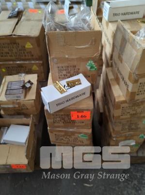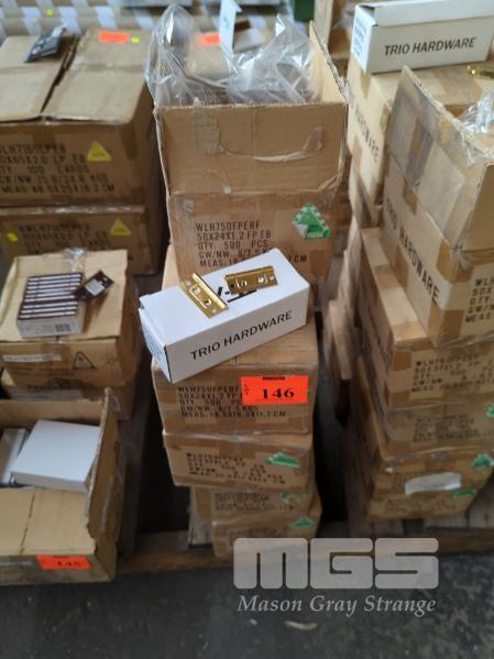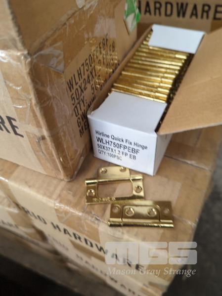 QUANTITY OF TRIO-WARLAN HIRLINE QUICK FIT HINGES - 50 X 24 X 1.2 MM. FIXED PIN. BRASS PLATED. 9 X TRADE PACKS OF 500 PIECES EACH.