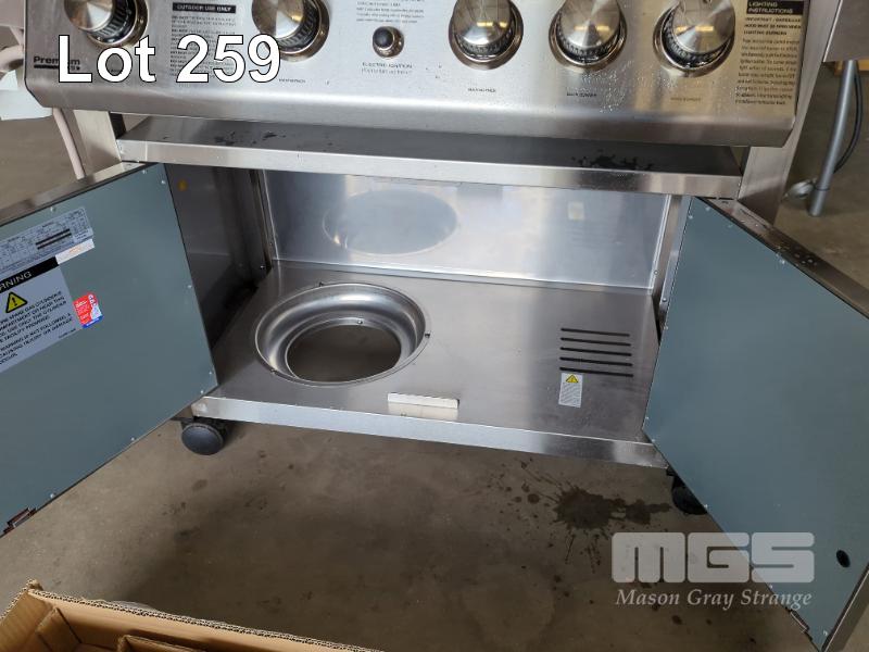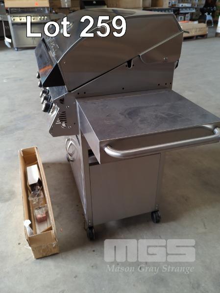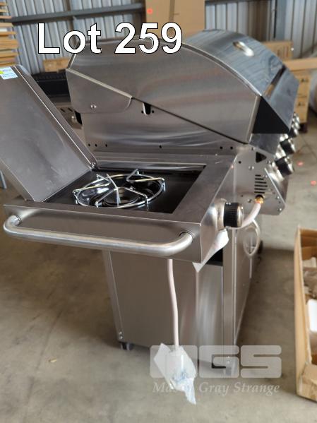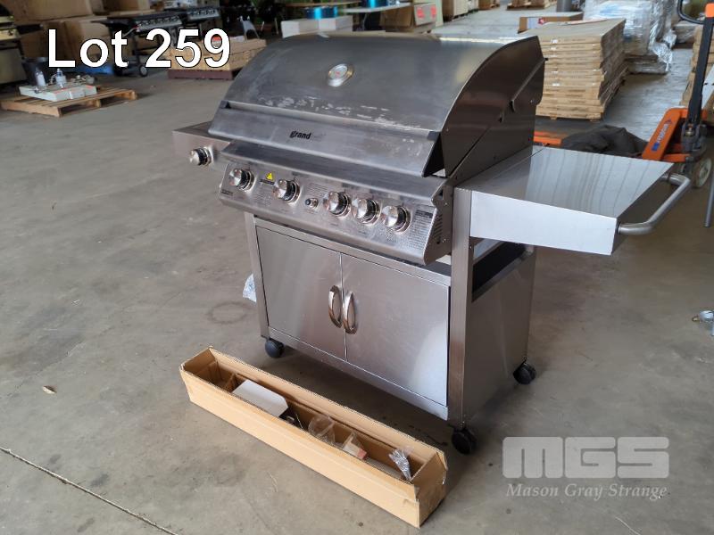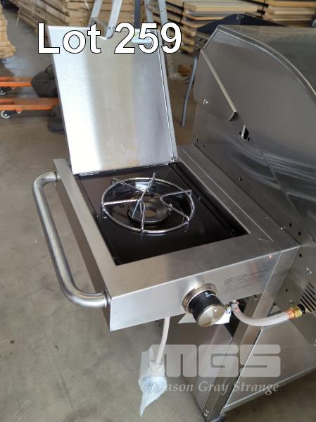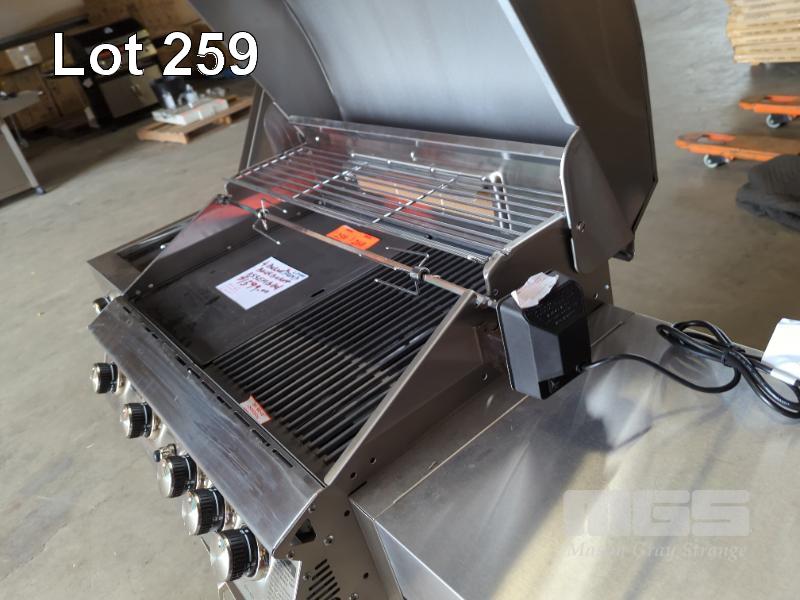 GRANDHALL PREMIUM 4S STAINLESS STEEL COVERED COOKER BBQ 4-BURNER WITH SIDE BURNER, BACKBURNER & CABINET TROLLEY. NEW IN BOX (2 x BOXES) RRP $1,599. WITH... ELECTRIC STAINLESS STEEL ROTISSERIE KIT 240V A.C. MOTOR 935 MM SPIT ROD, 2 X SKEWER FORKS, COLLAR, MOUNTING BRACKETS ETC. RRP $139