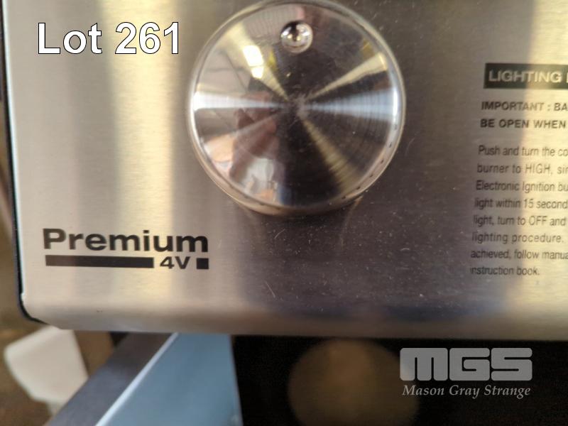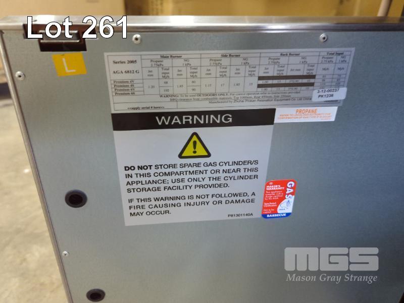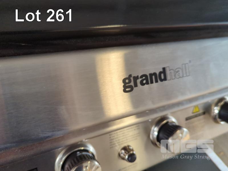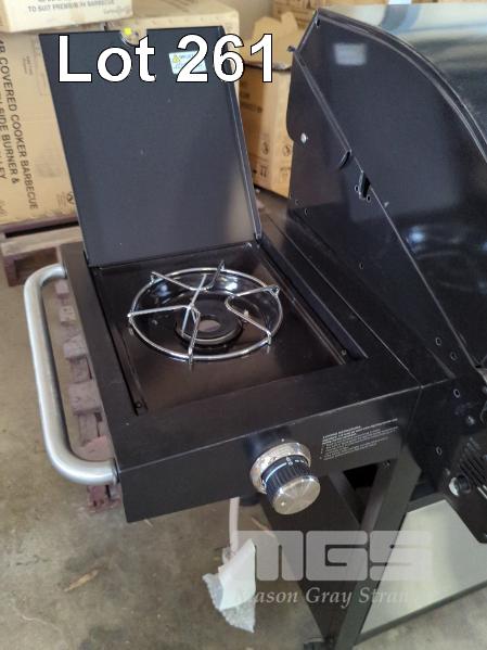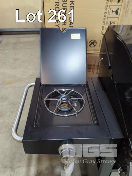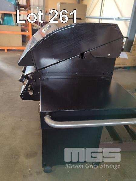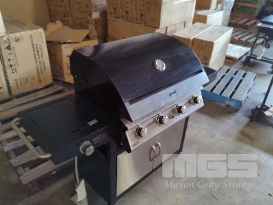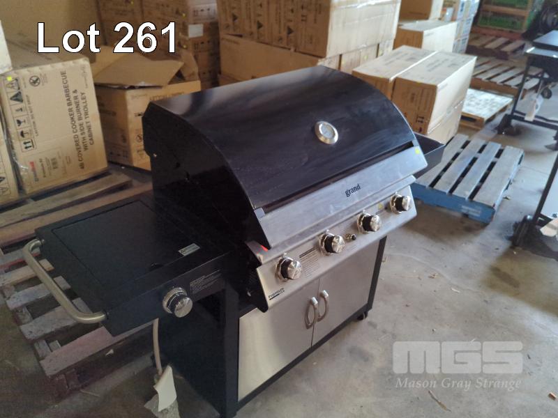 GRANDHALL PREMIUM 4V GLOSS BLACK COVERED COOKER GAS BBQ. 4-BURNER WITH SIDE BURNER & CABINET TROLLEY. NEW IN BOX (2 x BOXES). RRP $599