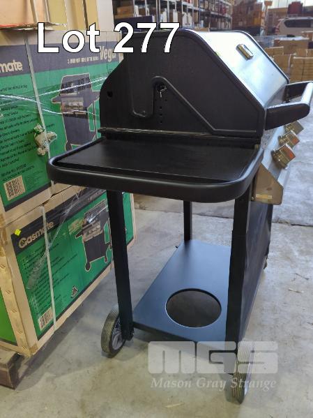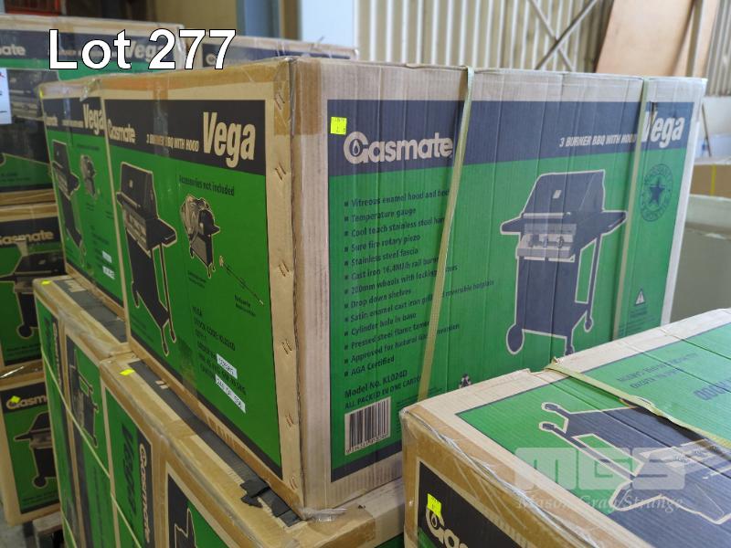 GASMATE VEGA MOBILE HOODED GAS BBQ. 3-BURNER IN VITREOUS ENAMEL WITH STAINLESS STEEL FASCIA. NEW IN BOX. RRP $399