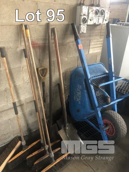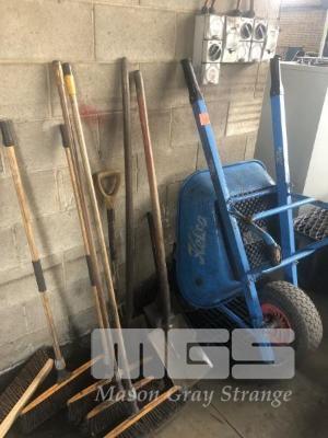 WHEELBARROW & ASSORTED TOOLS, SHOVELS & BROOMS