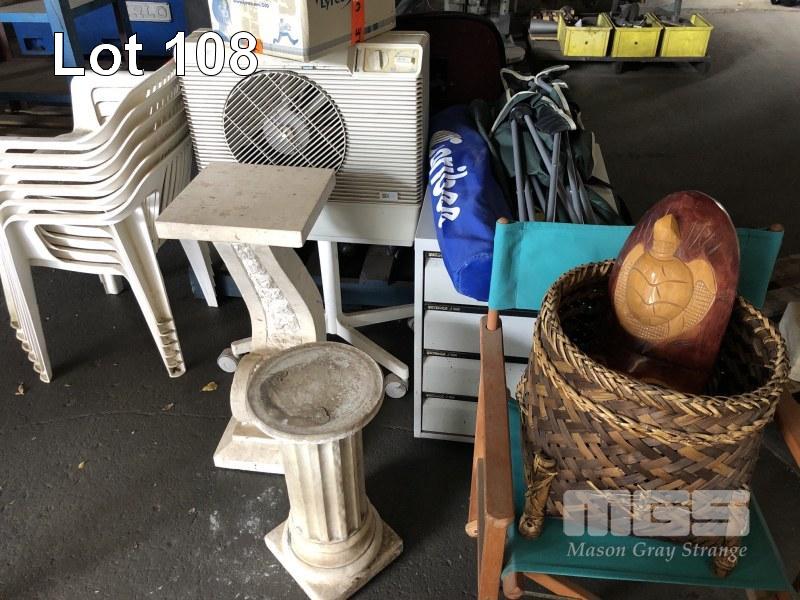 PLASTIC CHAIRS, OFFICE CHAIRS, WATER COOLER, 4 DRAWER STEEL CABINET, 2 x PEDESTALS & HOMEWARES