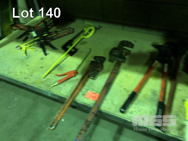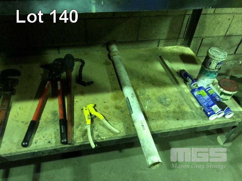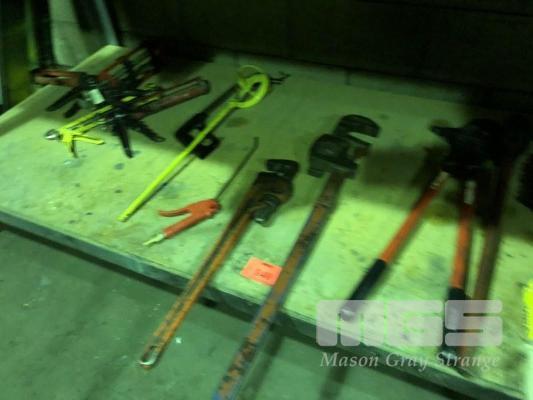 2 x STILSONS, BOLT CUTTER, PAINT STIRRER, PIPE CHAIN CLAMP, APPLICATION GUNS, ASSORTED SEALANTS & GREASE