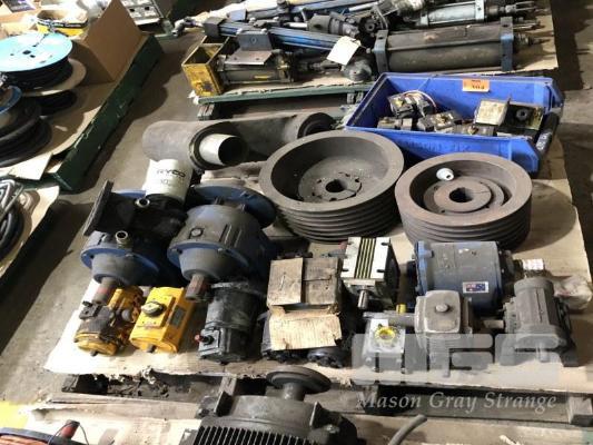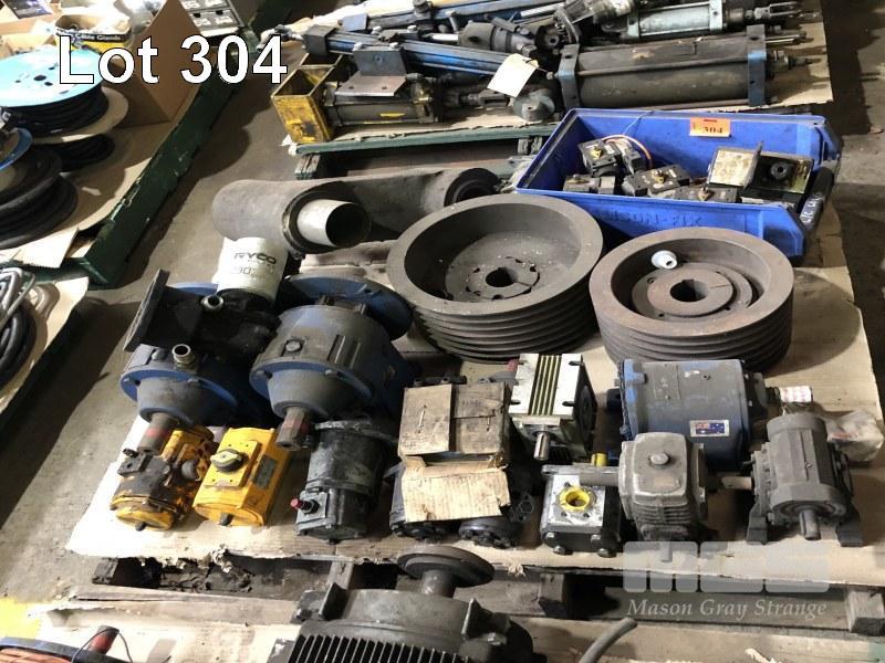 PALLET OF ASSORTED REDUCTION GEARBOXES, RIGHT ANGLE DRIVES, 2 x LARGE MULTI BELT PULLEYS