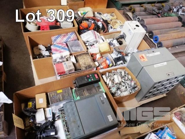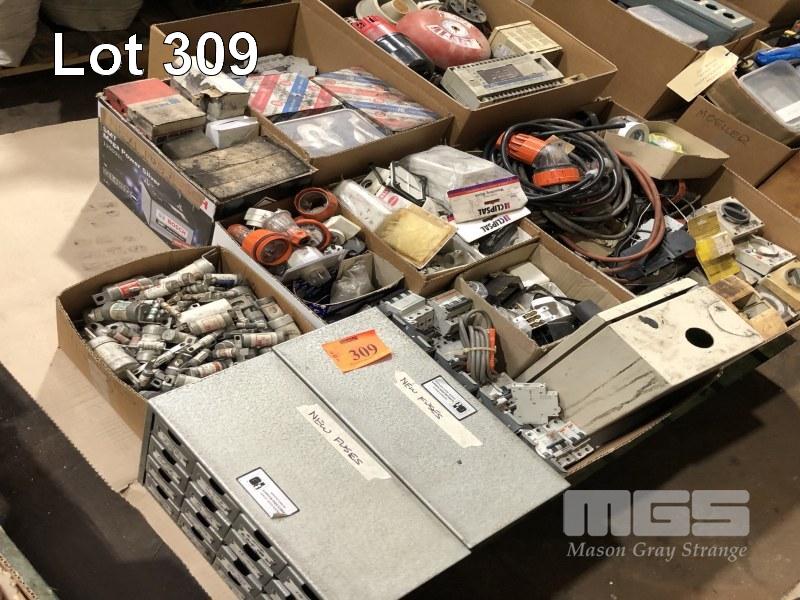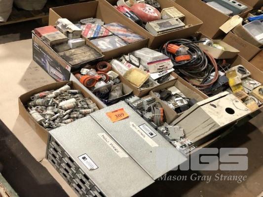 PALLET OF ELECTRICAL FITTINGS, CIRCUIT BREAKERS, PLUS SWITCHES, FUSES, PLCS ETC. PLUS VSDS, SWITCHMODE POWER SUPPLIES AND AC ADAPTERS.