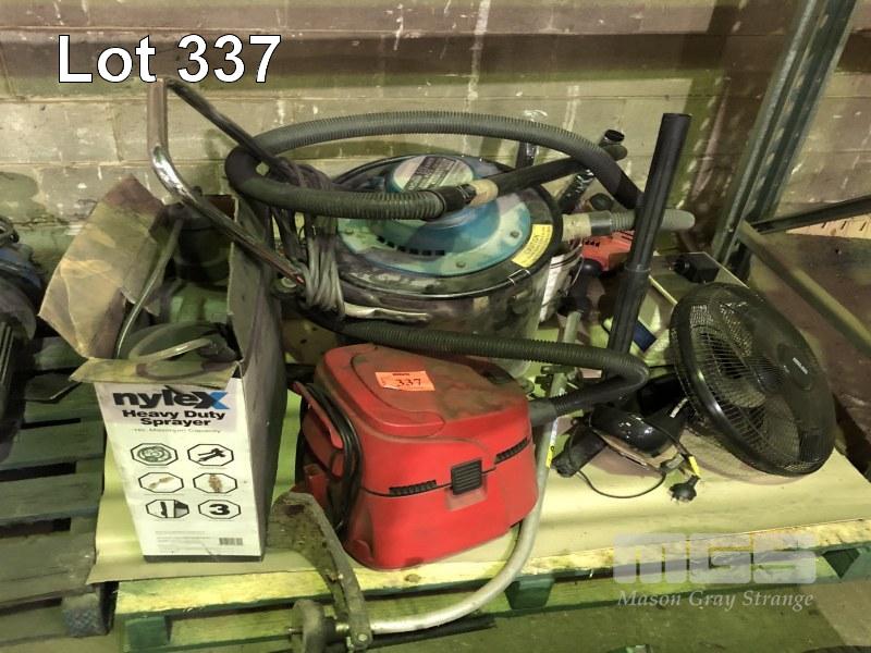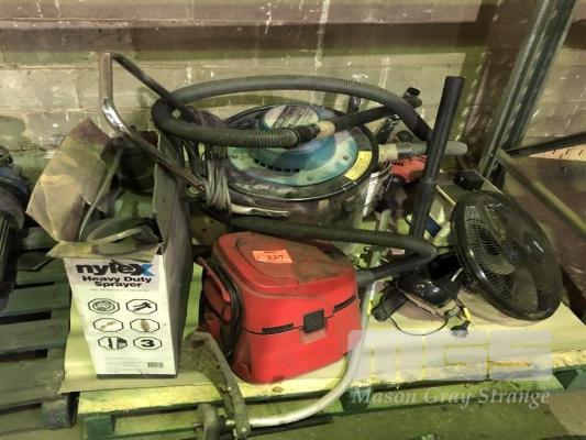 PALLET OF ASSORTED HOME TOOLS, WHIPPER SNIPPER, WET DRY VAC, VACUUM, BACK PACK SPRAYER