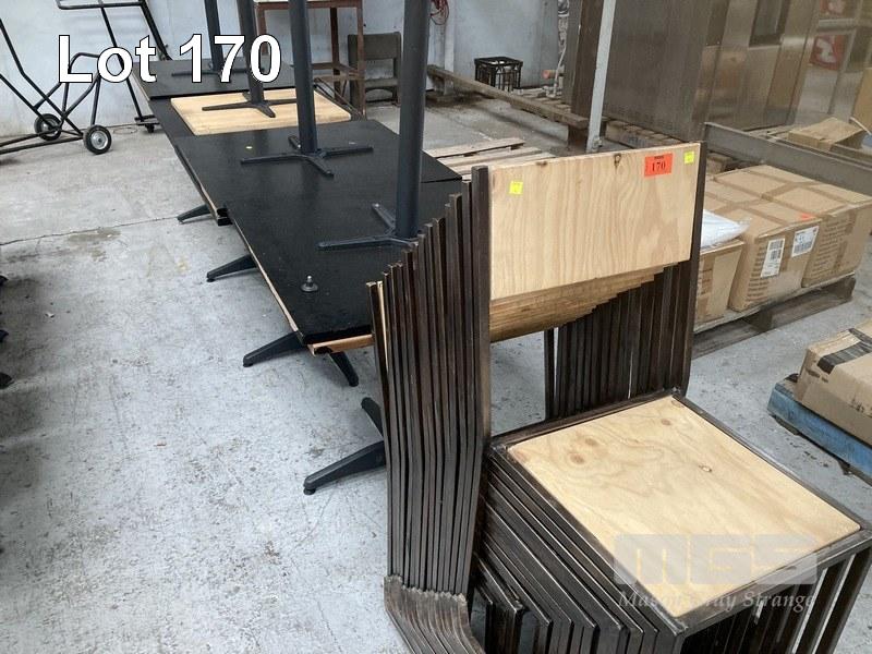 7 x ASSORTED CAFE TABLES, EACH 80 x 80cm & 15 x CHAIRS, TIMBER SEAT & BACK, STEEL FRAME