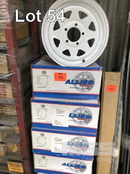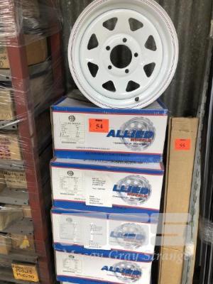 7 x ALLIED SUNRAISER STYLE RIMS, 14 x 6 x 114.3mm, 5 STUD, WHITE, NEW IN BOX