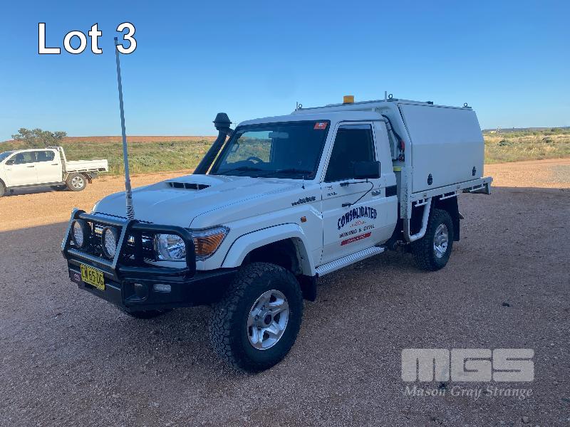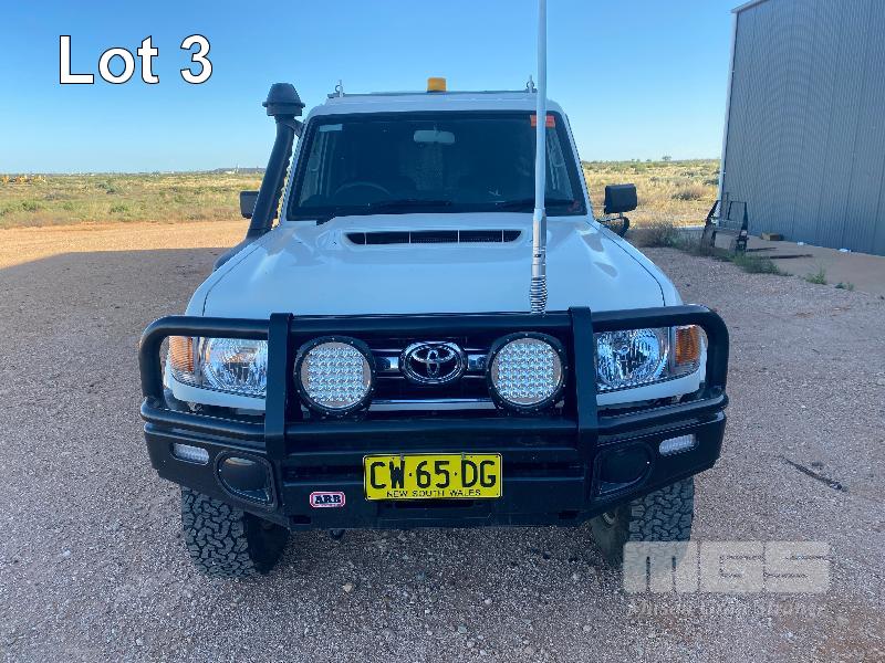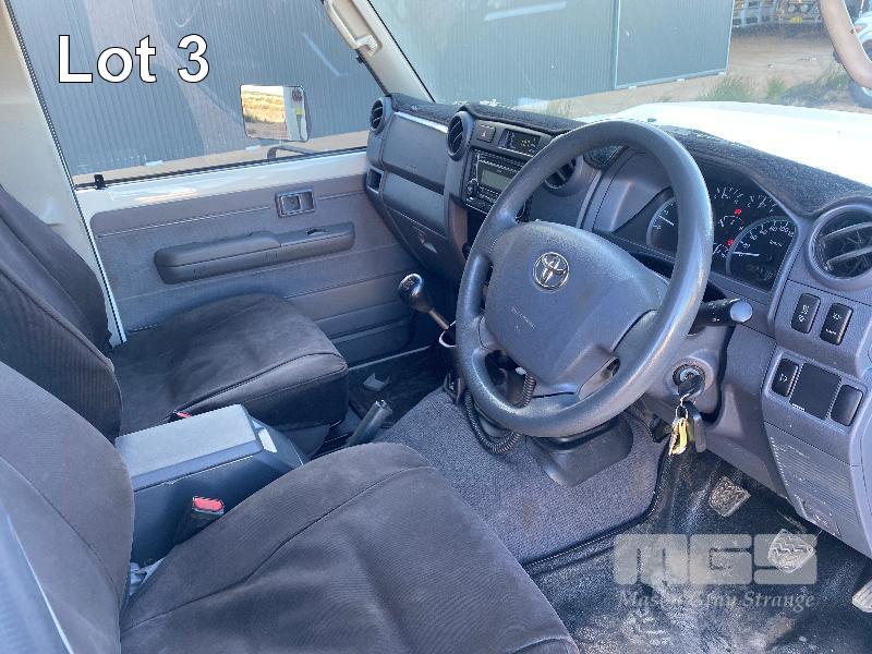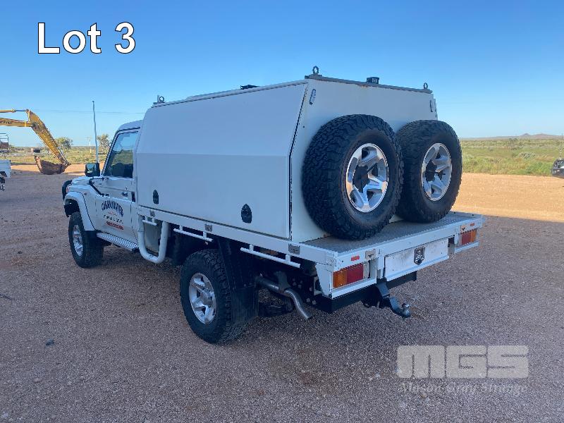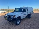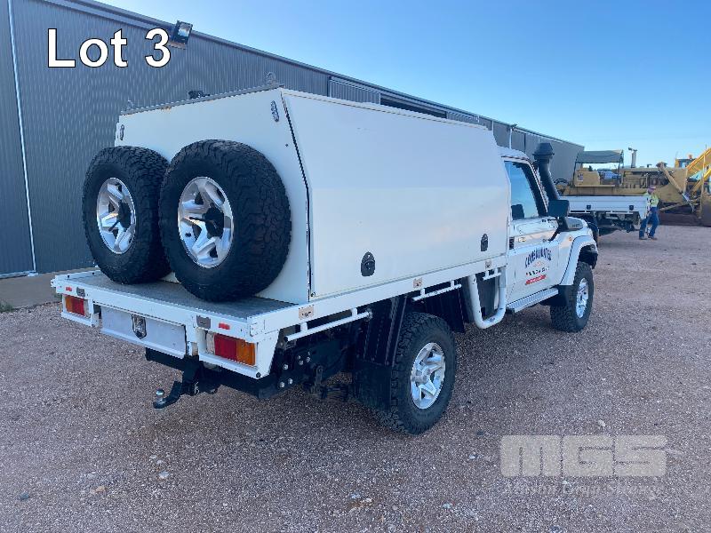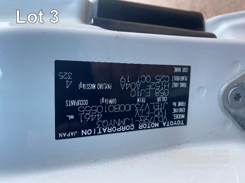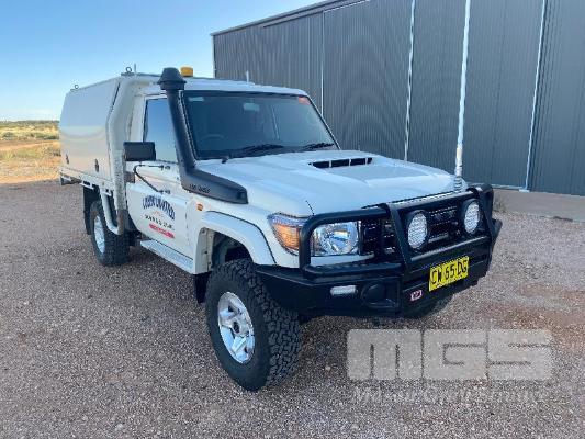 2019 TOYOTA LANDCRUISER GXL CAB CHASSIS 4x4 VIN: JTELV73J00B010555 ODO: 62,900kms 5 SPEED MANUAL TRANSMISSION, 4x4 ALLOY WHEELS, BULL BAR, FOG LAMPS, MOD: VDJ79R-TJMNYQ3 UHF RADIO REVERSE CAMERA SOLAR PANEL, PROJECTA 1800w INVERTER ENGEL FRIDGE REMOVABLE TRADESMAN TOOL BOX FITOUT 2 x SPARE WHEELS UPGRADED SUSPENSION REAR TRAY DRAWER WATER TANK TWO PACK (WITH PAPERS, WITH OWNER'S MANUAL, WITH SERVICE BOOKS)