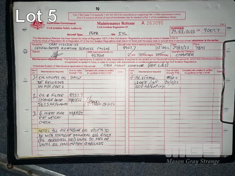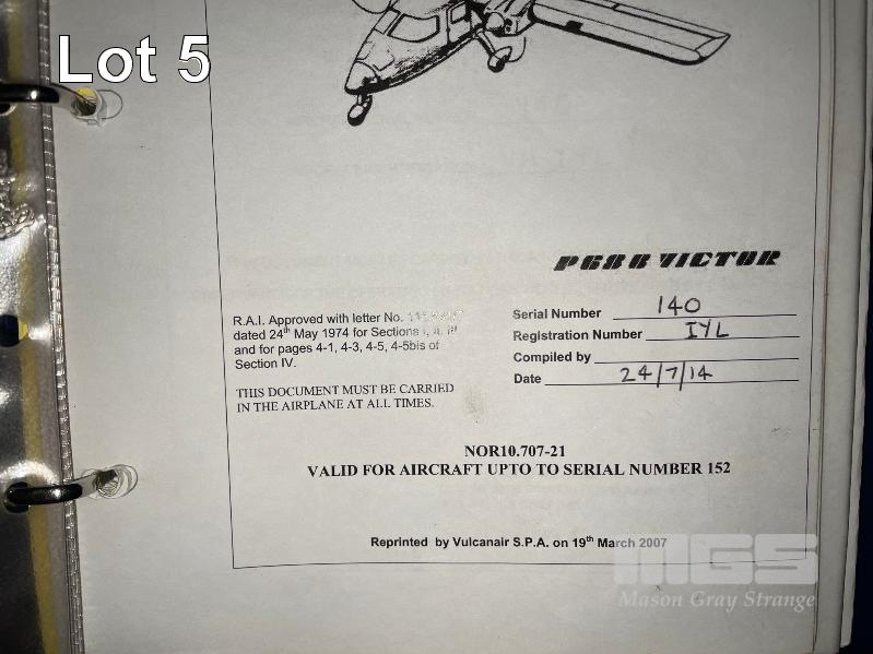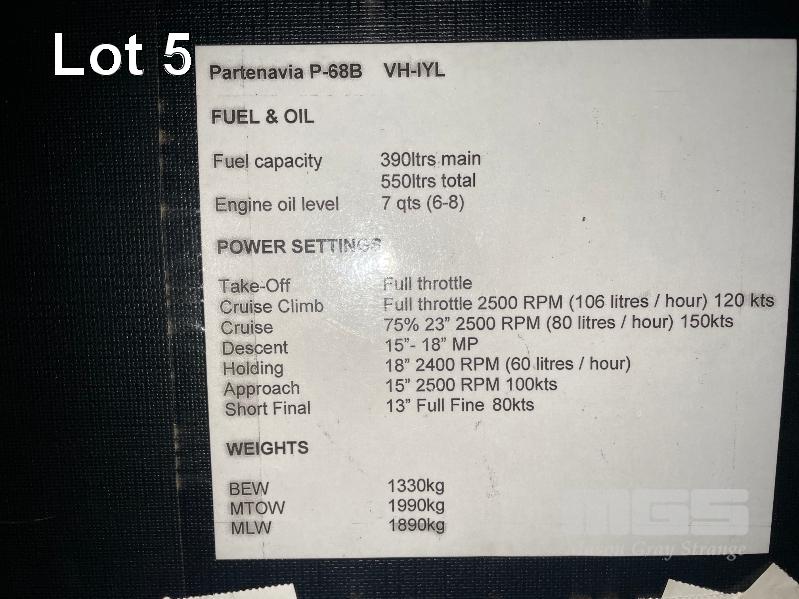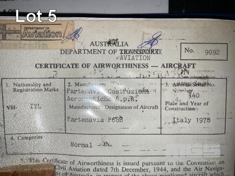 PARTENAVIA AIRCRAFT MODEL: PN68 SERIAL NUMBER: P68B SER NO 140 YEAR OF MANUFACTURE: 1978 HOURS: 8907.7 REGO: VH-IYL HOURS TO RUN ENGINES AND PROPS LH ENGINE 996.9 TR, CALENDAR EXPIRES 09/08/2025, RH ENGINE 1990 TR, CALENDAR EXPIRES 29/03/2034, PROPELLERS BOTH 1489.3 TSO, BOTH CALENDAR EXPIRED CURRENTLY UNDERGOING OVERHAUL OPERATING CATEGORYIFR CHARTER INSTRUMENTS FITTED: GARMIN GTN650 COM 1 / GPS, KR87TSO ADF, CENTURY 3 AUTOPILOT, STORMSCOPE, KMA20TSO AUDIO PANEL, GTX330 ADSB TRANSPONDER, GARMIN SL40 COM 2, GME TX3220 INTEGRATED UHF.