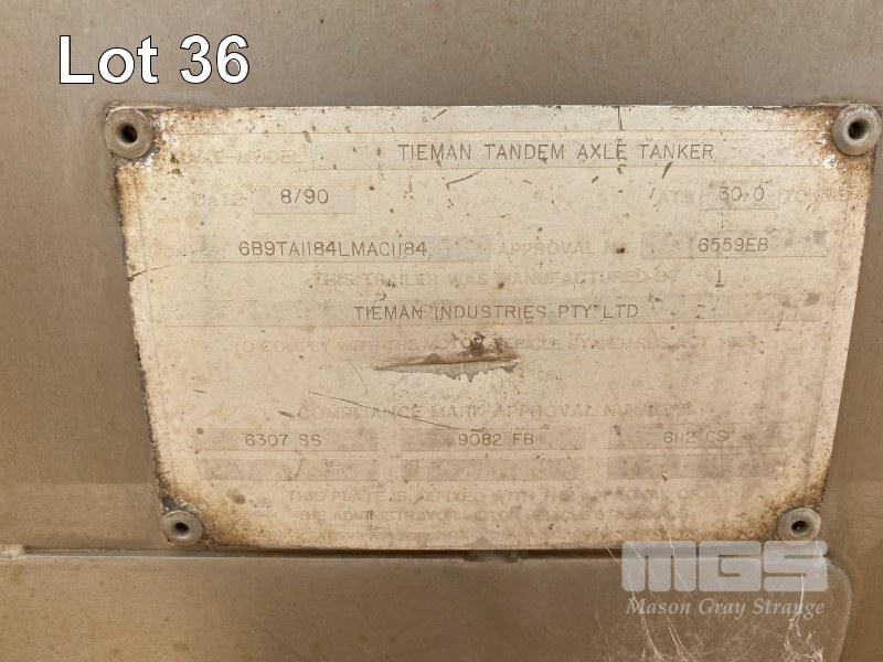 1990 TIEMAN TANDEM AXLE FUEL TANKER REG: YN 98 FP VIN / CHASSIS: 6B9TA1184LMAC1184 ATM: 30 TONNE SPRING SUSPENSION, UNIT NO: 248 CAPACITY: 23,000 LITRE STAINLESS INSULATED BODY SPIDER HUBS 50MM KING PIN (NO PAPERS)