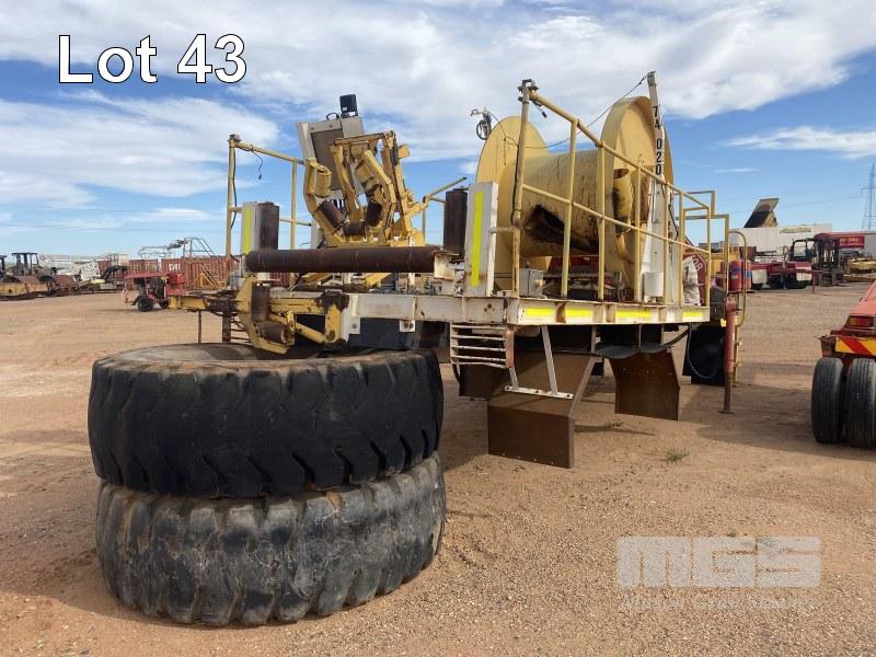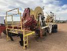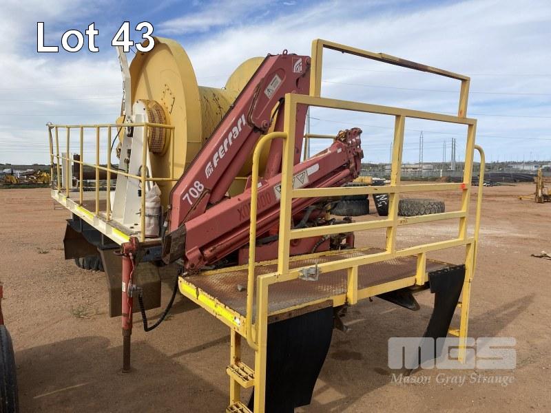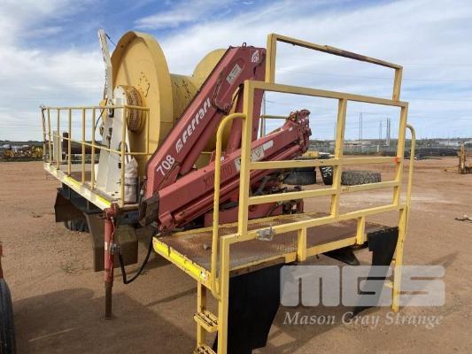 CUSTOM, TANDEM AXLE, HYDRAULIC CABLE REEL TRAY TOP BODY COMPLETE WITH SINGEL SPOOL HYDRAULIC CABLE CARRIER LEFT TO RIGHT TENSION ROLLER & FERRARI TRUCK MOUNT CRANE MOD: 708 WITH OUTRIGGERS