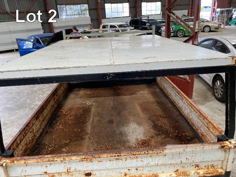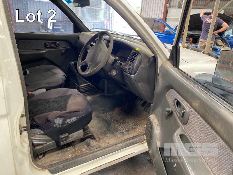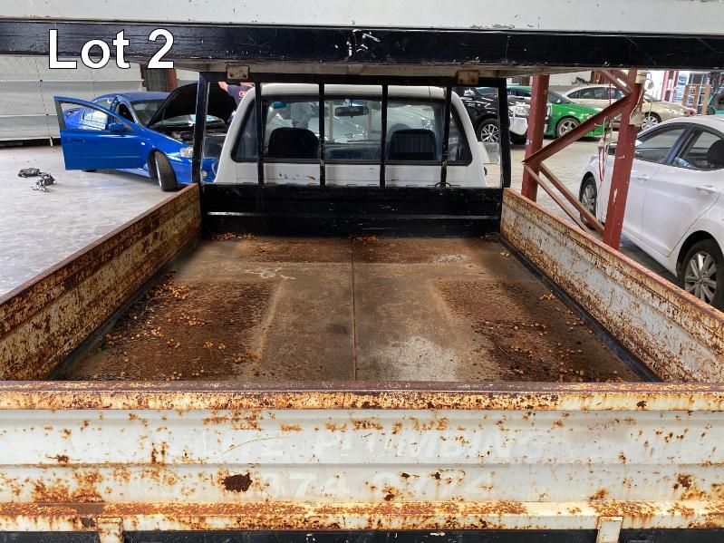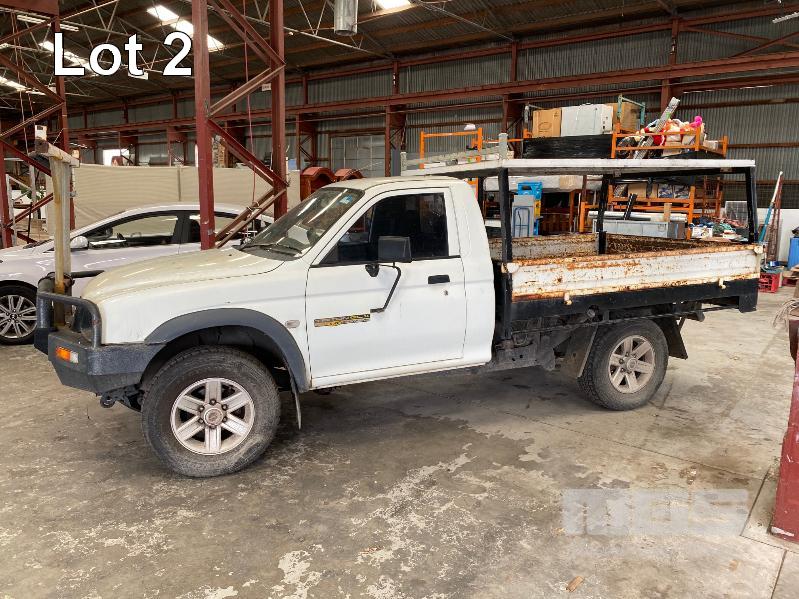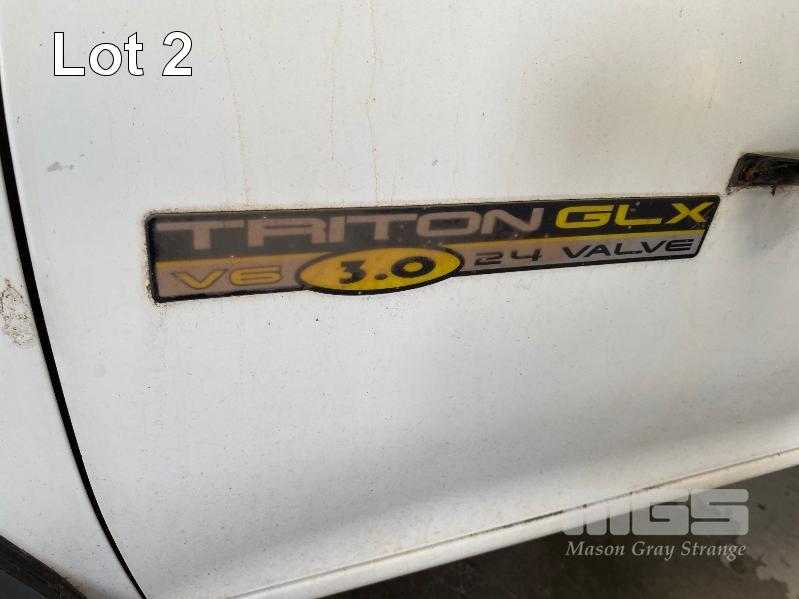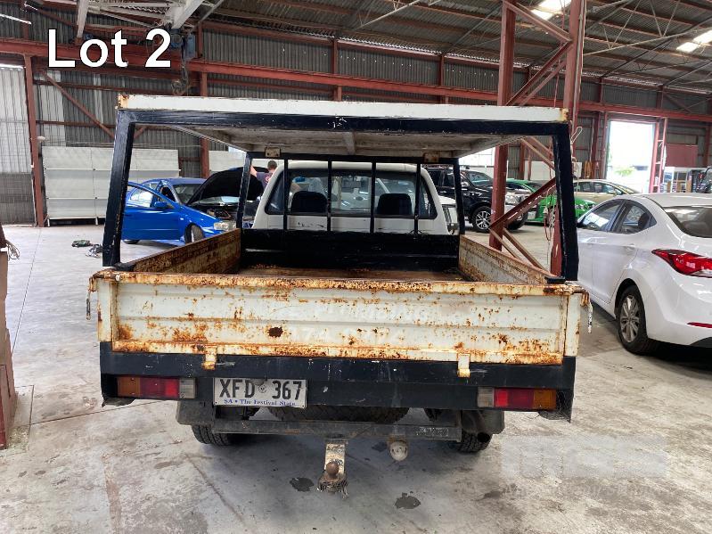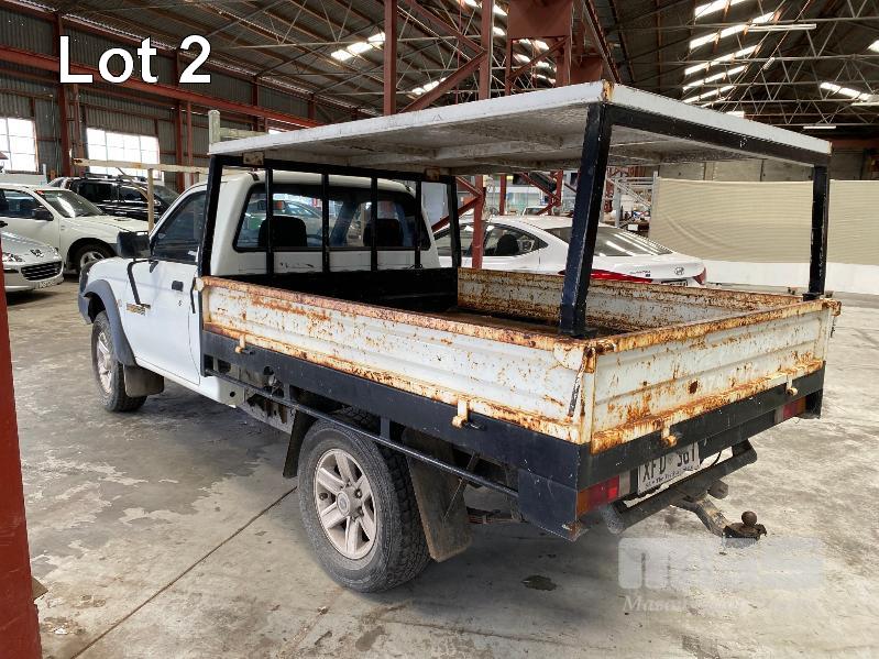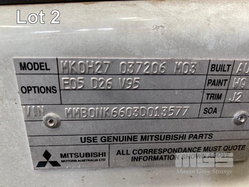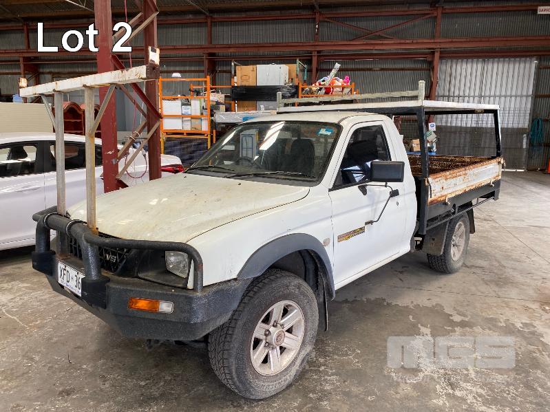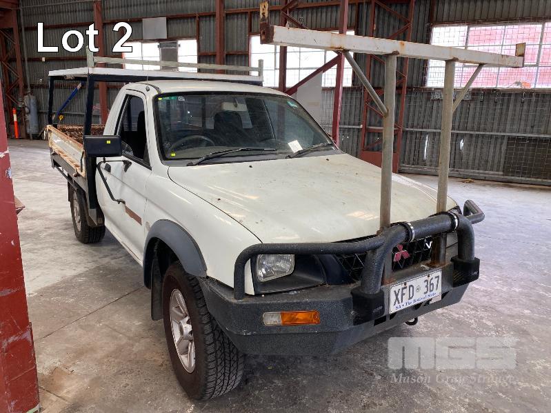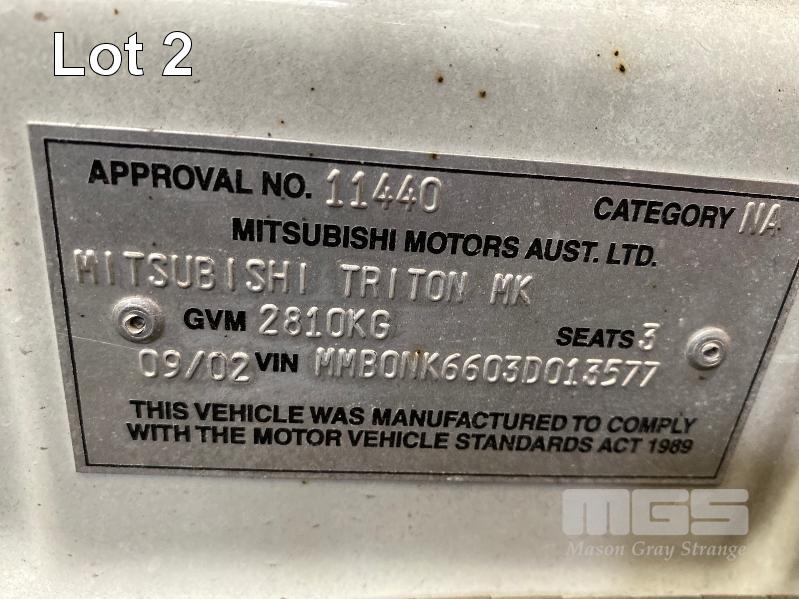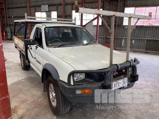 2002 MITSUBISHI MK TRITON GLX TRAYTOP REG: XFD 367 (SA) VIN: MMB0NK6603D013577 ODO: 195,600kms SHOWING 3.0 LITRE, V6 PETROL, 5 SPEED MANUAL TRANSMISSION, WHITE DUCO, 2 DOORS, 3 SEAT, AIR CON, ALLOY WHEELS, BULL BAR, LADDER RACK, SPARE WHEEL, TOW BAR, FITTED WITH STEEL UTE CANOPY WITH REGO PAPERS (WITH PAPERS, WITH 1 KEY/S)