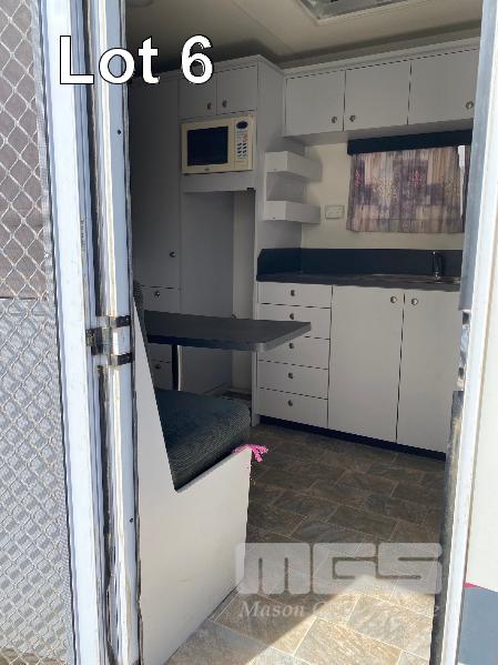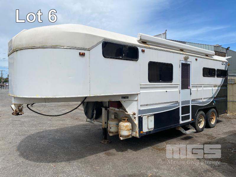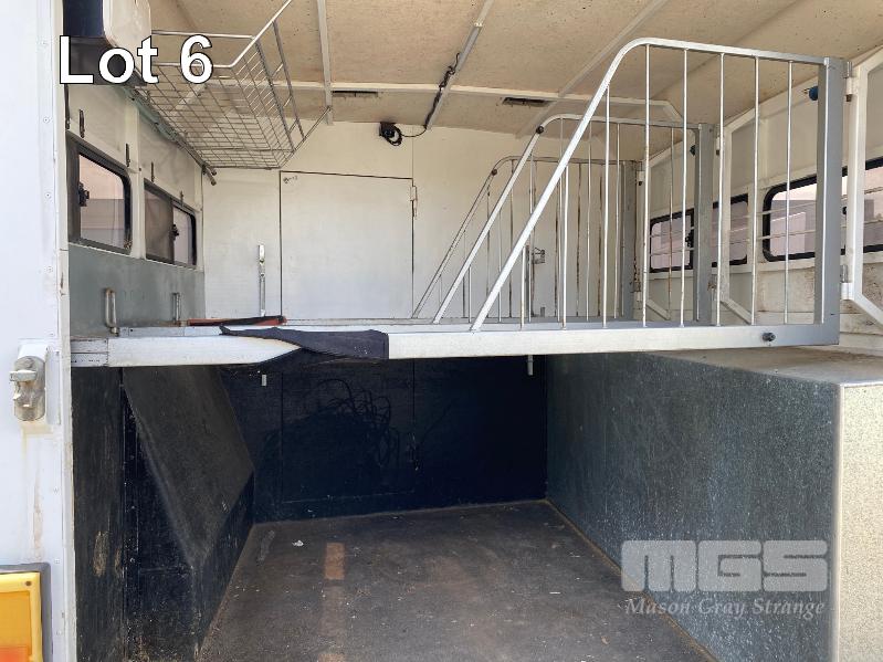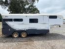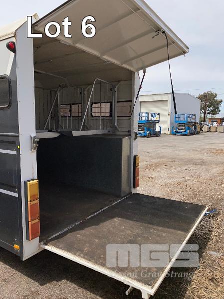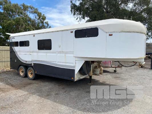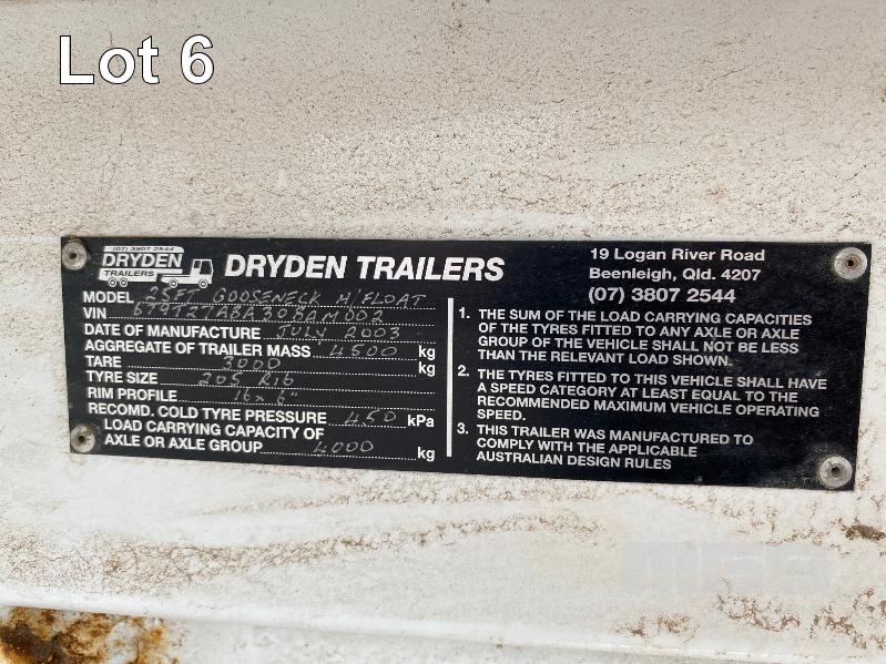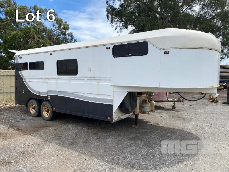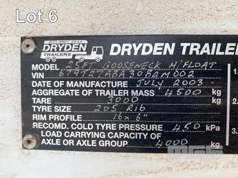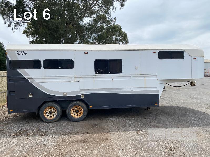 2003 DRYDEN TRAILERS TANDEM AXLE HORSE FLOAT MODEL: 25FT GOOSENECK REG: S176 TCX VIN / CHASSIS: 6T9T27ABA30BAM002 SIZE : 25 x 8ft (7600 x 2480mm) 3 HORSE ANGLED STALLS WHITE & BLACK BALL HITCH, ELECTRIC BRAKES WITH BRAKE AWAY EMERGANCY BRAKING SYSTEM, LIVING QUARTERS, FULLY PARTITIONED FROM HORSE STORAGE WITH ACCESS DOOR FULL KITCHEN, DINING & 3 PERSON SLEEPING QUARTERS, POWER & LIGHTING, INTERNAL & EXTERNAL HEAPS OF STORAGE SPACE, HANGING CUPBOARDS, UNDER SEAT STORAGE, OUTSIDE LOCKABLE STORAGE COMPARTMENT BELLY WATER TANK WITH 12V PUMP, REAR UTILITY SHOWER, PULL OUT AWNING, EXTERNAL TIE POINTS CCTV CAMERA FOR HORSE COMPARTMENT REMOVABLE HORSE STALLS WITH HEAD DIVIDERS, BRIDLE & SADDLE STORAGE RACKS MASS: 3,000kg GTM: 4,500kg WITH REGO PAPERS & KEYS KEY #25 (WITH PAPERS)