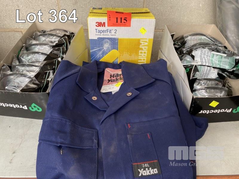 20 x PAIRS SAFETY GLASSES, PROTECTOR, 1 x BOX EAR PLUGS & HARD YAKKA OVERALLS, 74L