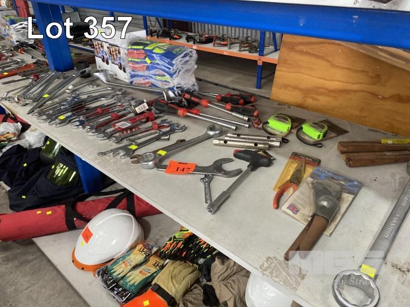 QUANTITY ASSORTED HAND TOOLS, SIDCHROME, ETC INC OPEN END & RING SPANNERS, 41 TO 6mm, HEX DRIVERS, PIPE WRENCH, RATCHET SPANNER, 36mm, TAPE MEASURES, 10 x PAIRS HIGH VIS RIGGERS GLOVES & 2 x 3m PELTOR HELMET EAR MUFFS 1 x SHELF