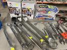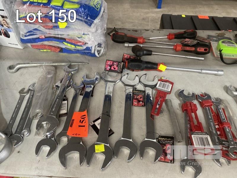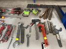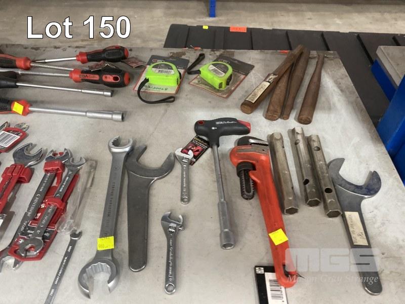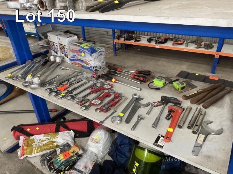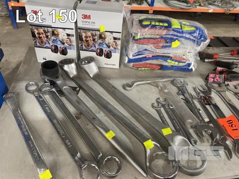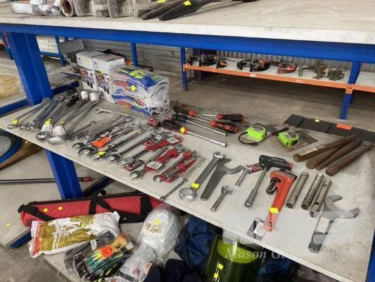 QUANTITY ASSORTED HAND TOOLS, SIDCHROME, ETC INC OPEN END & RING SPANNERS, 41 TO 6mm, HEX DRIVERS, PIPE WRENCH, RATCHET SPANNER, 36mm, TAPE MEASURES, 10 x PAIRS HIGH VIS RIGGERS GLOVES & 2 x 3m PELTOR HELMET EAR MUFFS 1 x SHELF