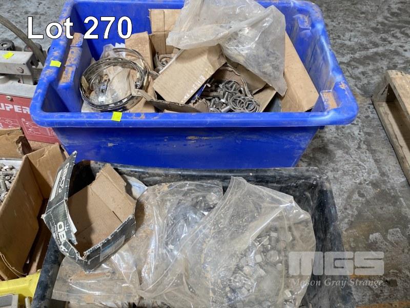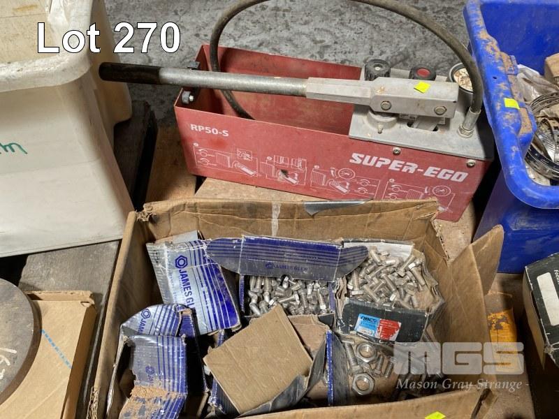 ASSORTED NUTS & BOLTS, BRACKETS, ETC, STAINLESS STEEL & BLACK STEEL, U-BOLTS, SUPER EGO PRESSURE TEST PUMP, ETC
