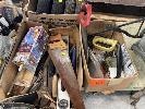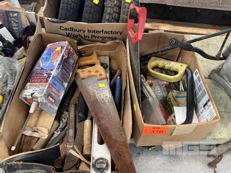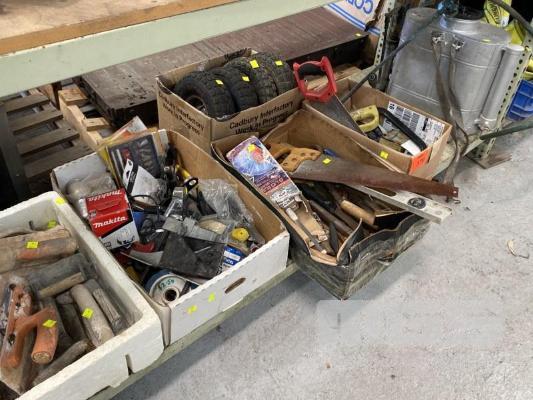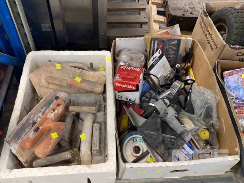 ASSORTED HAND TOOLS, CONCRETE FINISHING TOOLS, 4 x SACK TROLLEY TYRES, GME EPIRB ACCUSAT, FASTENERS, REGA BACKPACK SPRAY UNIT, GALV STEEL, ETC, 5 x BOXES