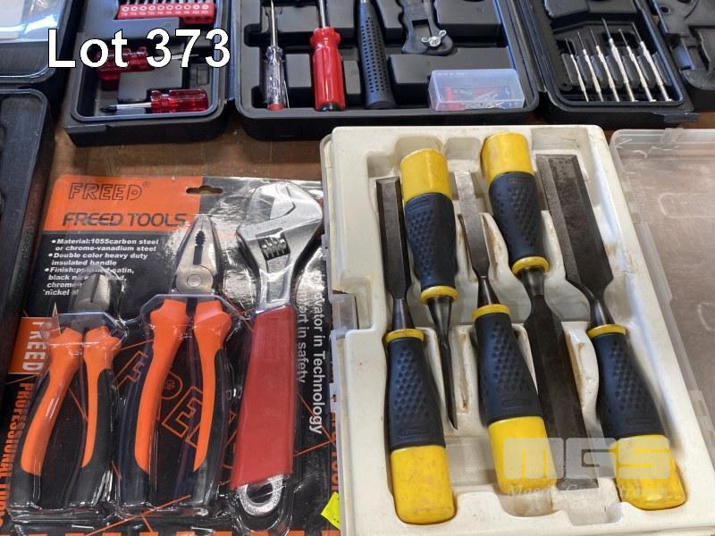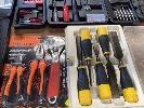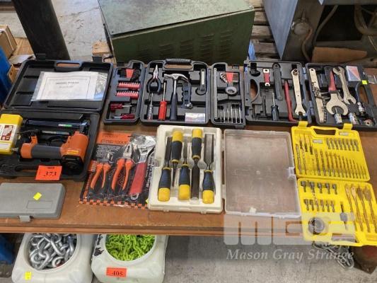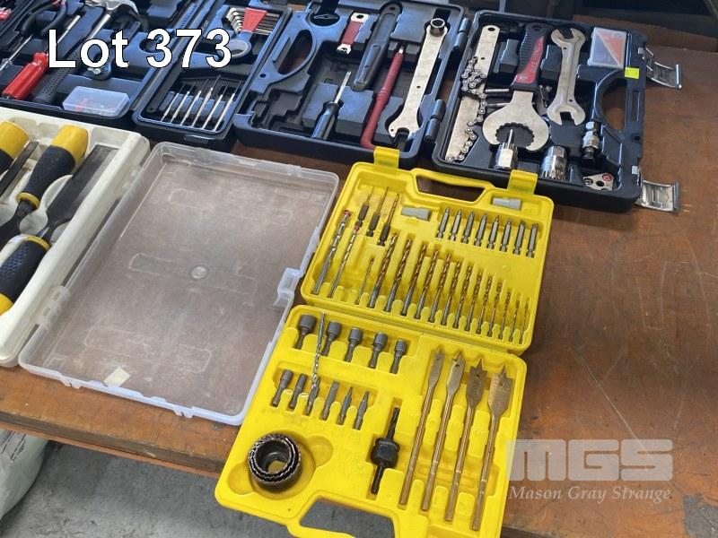 ASSORTED HAND TOOLS, DRILL BIT SET, CHISEL SET, ETC