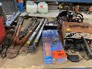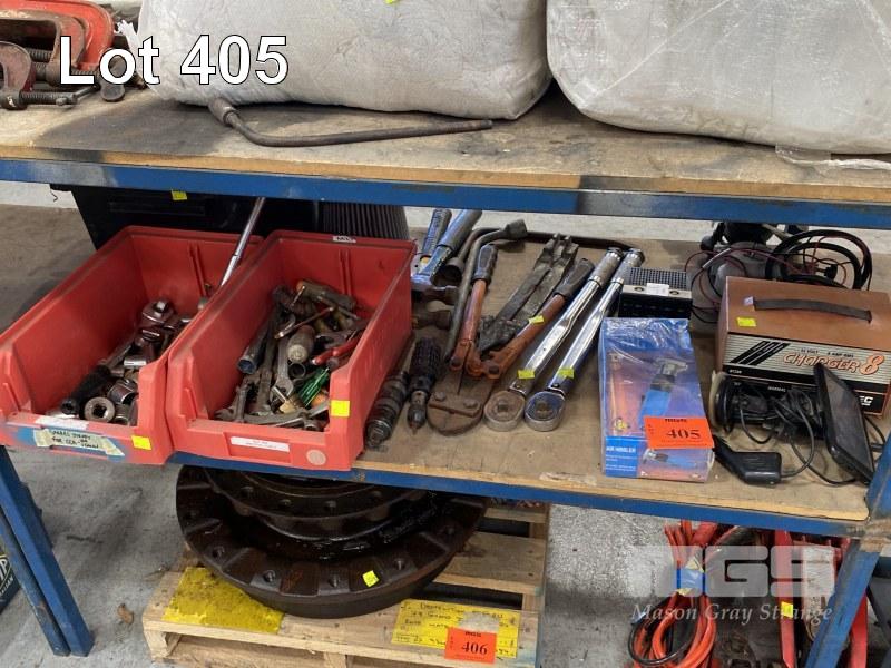 AIR POWER NIBBLER, (AS NEW), HAND TOOLS INC SOCKETS, SPANNERS, BOLT CUTTERS, 2 x RATCHET TORQUE WRENCHES, NAVMAN GPS UNIT WITH HOLDER, ARLEC BATTERY CHARGER, EXTENSION LEADS & DRILL BIT SHARPENER, 240V