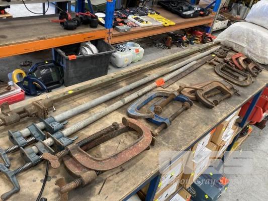 12 x ASSORTED G-CLAMPS UP TO 300mm & 4 x SLIDING SASH CLAMPS, 1800, 1600, 1200 & 900mm