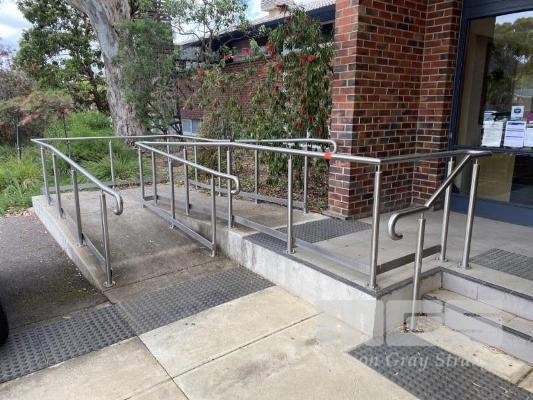 STAINLESS STEEL HAND RAIL, SUIT WHEEL CHAIR RAMP COMPRISING OF 23m TOP RAIL, 21m BOTTOM FLAT BAR, 24 x 1m UPRIGHTS ALL NON MAGNETIC STAINLESS STEEL (BUYER TO DISMANTLE)
