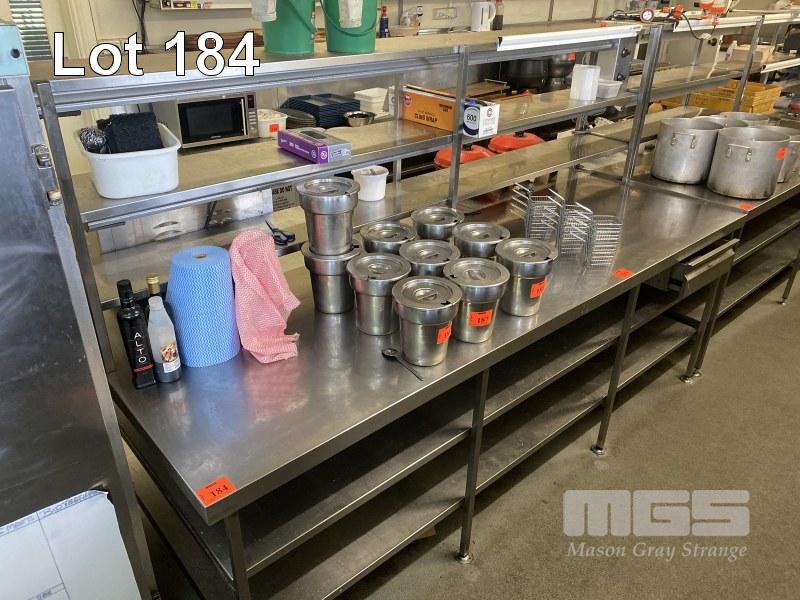 CENTER ISLAND STAINLESS STEEL BENCH, 3 TIER, 2700 x 1250mm, WITH 3 TIER SHELF, CONTAINING FULL LENGTH HELIOS HEAT LAMP, 240v